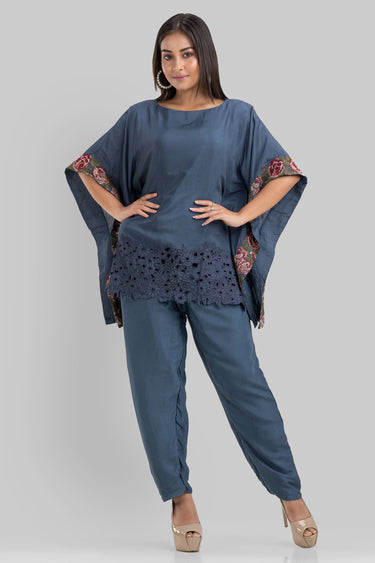 Exclusive Blue Cotton Fabric Printed Mandarin Collar Kaftan Style Readymade Co Ord Set