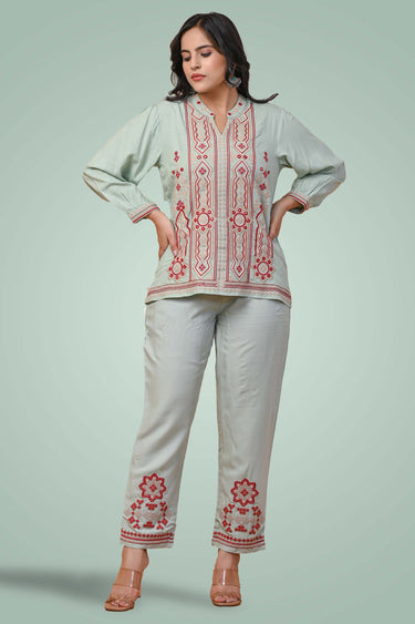 Upgrade your style with our exclusive green color cotton fabric embroidered co-ord set! The comfortable and breathable fabric ensures all-day comfort while the intricate embroidery adds a touch of elegance. The set comes with a mandarine collar style top featuring relaxed sleeves and a matching bottom that you can mix and match to create different looks. The readymade set is perfect for a casual day out or a special occasion. Elevate your wardrobe with this stylish and trendy co-ord set!