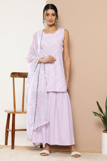 Exclusive Lavender Color Crepe Fabric Function Wear Printed Readymade Top With Bottom Dupatta Set