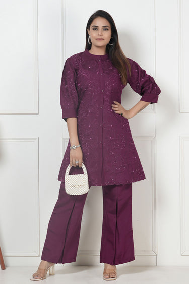Exclusive Purple Wine Embroidered Viscose Tunic With Pant