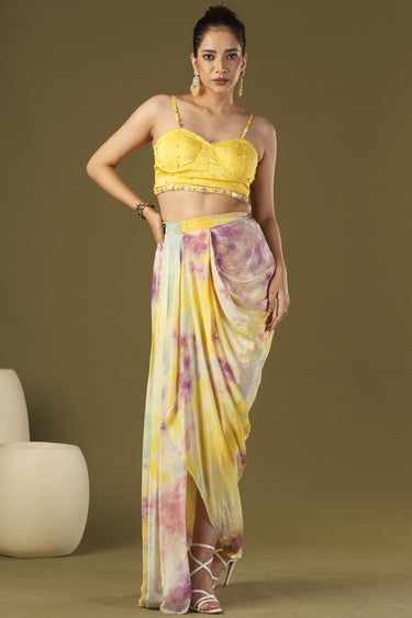 Elevate your style game with the Exclusive Yellow Color Viscose Crepe Fabric Embroidered Work Party Wear Designer Readymade Draped Skirt Set. The vibrant hues of ivory, yellow, plum and teal in the tie & dyed drape skirt are sure to turn heads at any party or event. Paired with a stunning yellow bustier that features hand embroidery with pearls and cowries for added glamour and sophistication. The comfortable viscose crepe fabric ensures a great fit and ease of movement, so you can dance the night away in style. Whether you're looking to make a bold statement or just want to add some color to your wardrobe, this designer skirt set is perfect for all occasions. Get ready to receive compliments as this exquisite outfit is sure to leave a lasting impression on everyone who sees it!