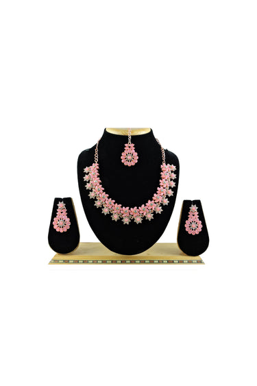 Fabulous Alloy Material Pink Color Necklace With Earrings and Mang Tikka