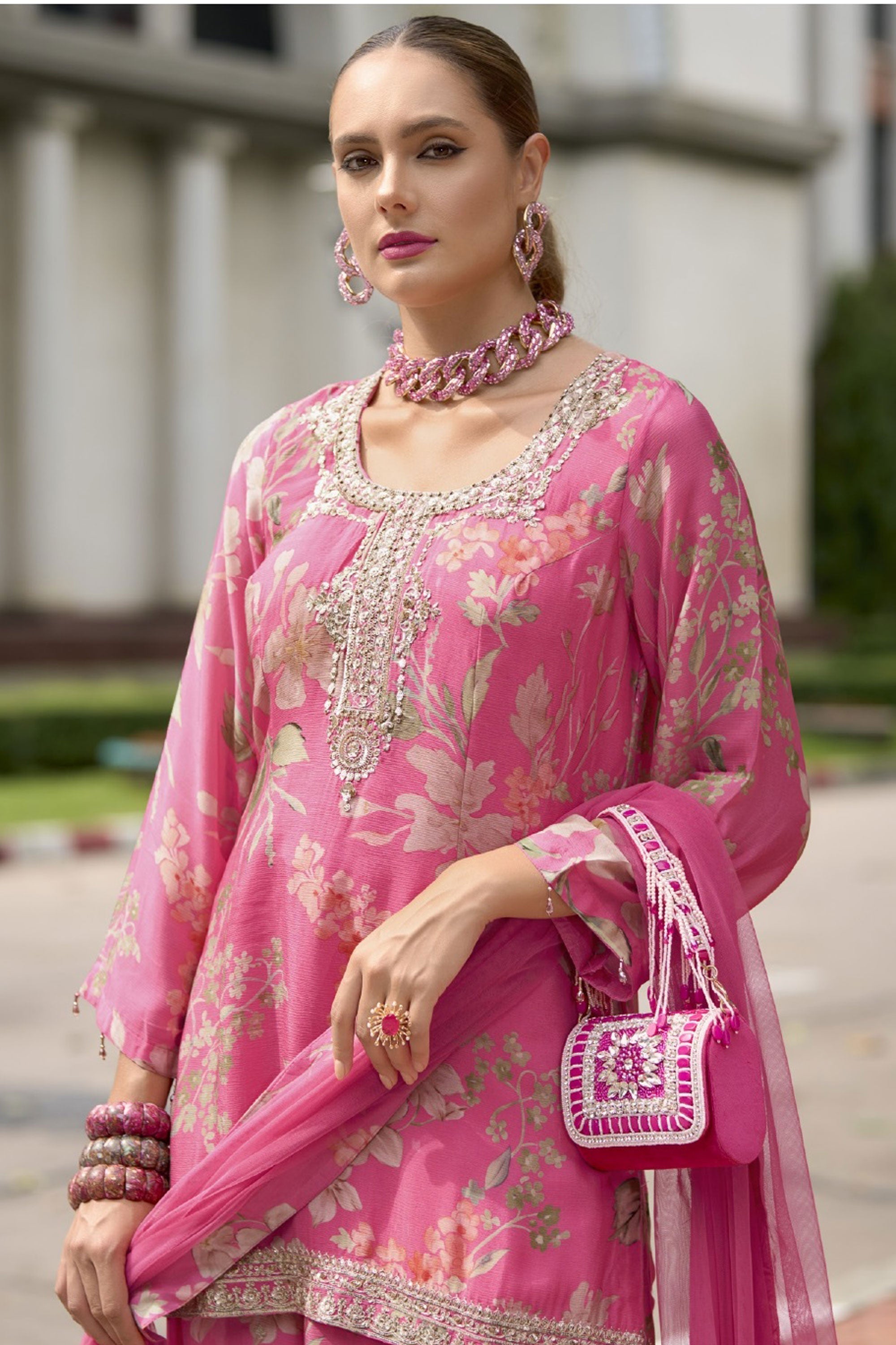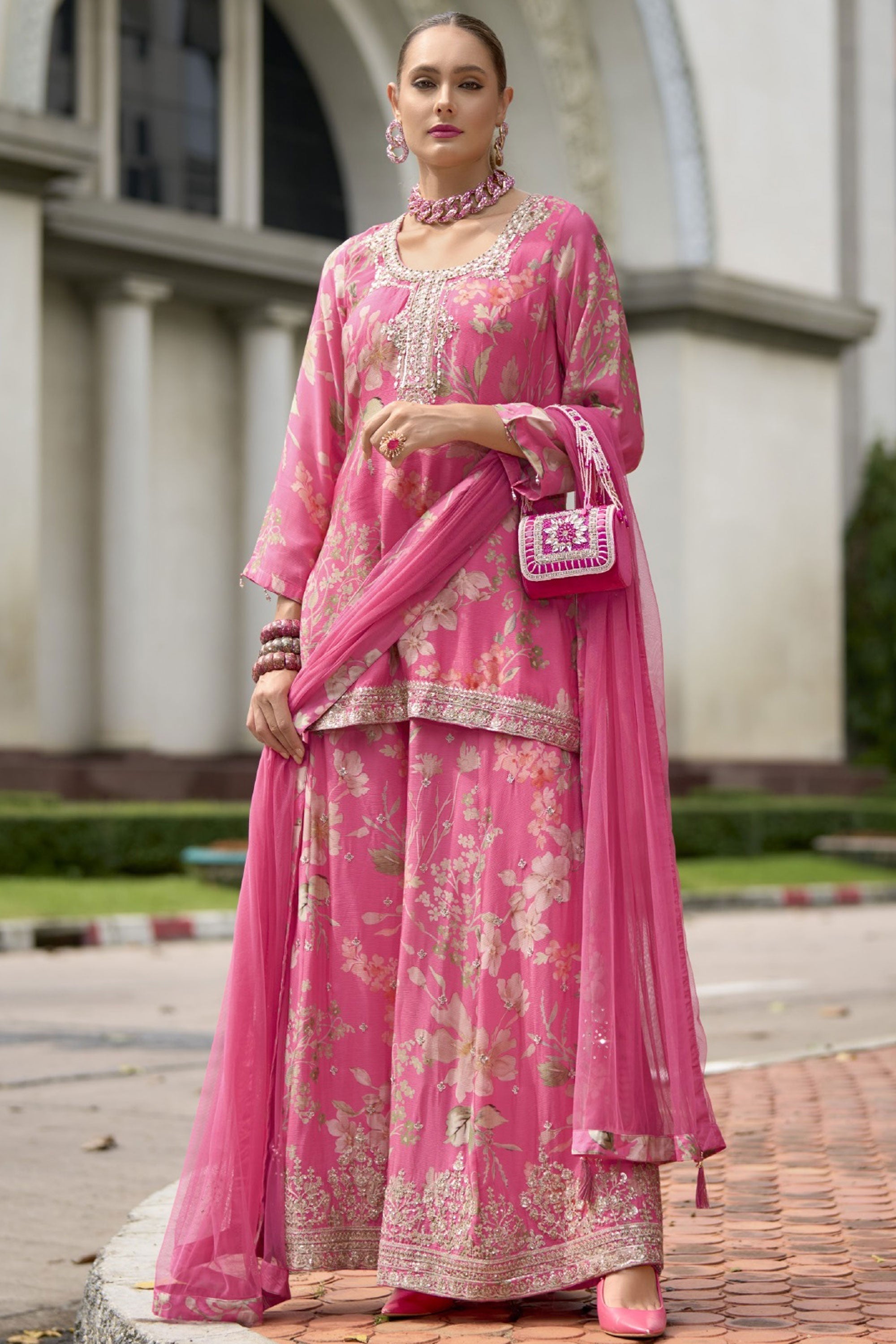 Fabulous Chinnon Fabric Pink Color Readymade Palazzo Suit