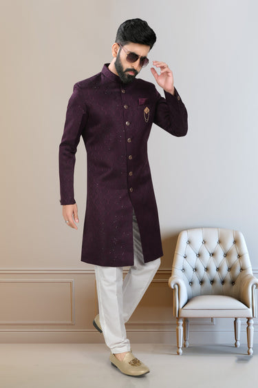 Fancy Fabric Designer Wedding Wear Readymade Indo Western For Men In Wine Color
