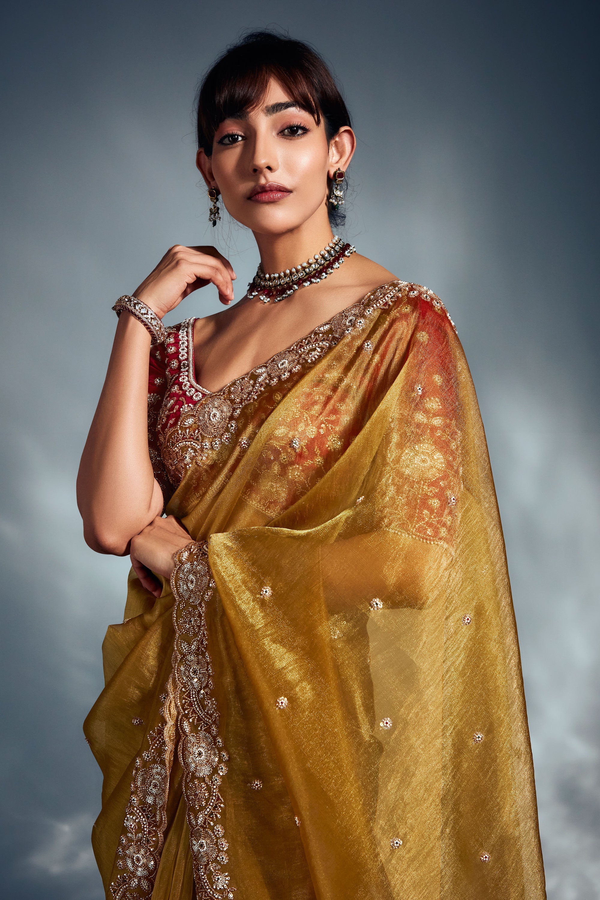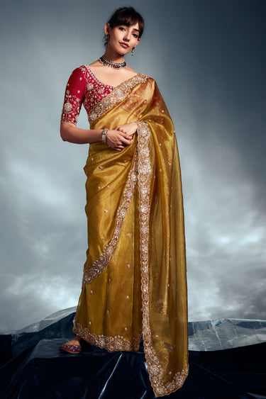 Fancy Heavy Work On Yellow Color Sober Saree In Organza Fabric
