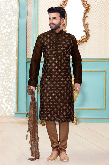 Fantastic Wedding Wear Dhupion Silk Fabric Brown Color Embroidered Work Kurta Pyjama For Men