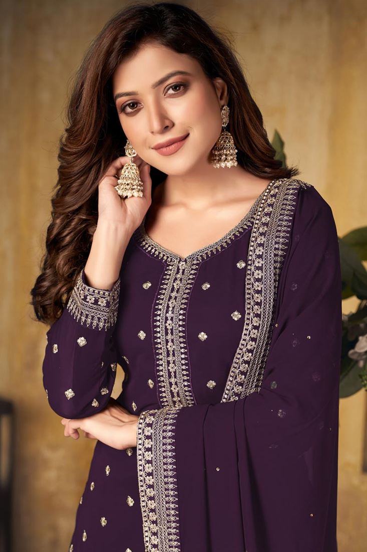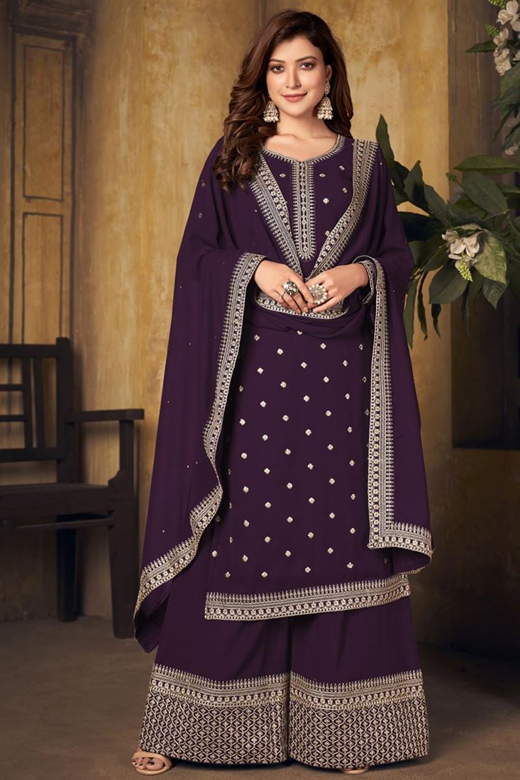 Fascinating Embroidered Work Purple Color Festival Wear Palazzo Suit In Georgette Fabric