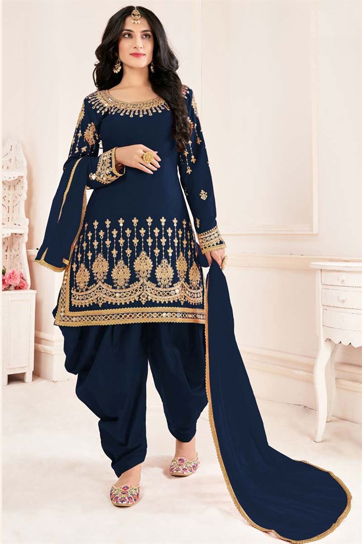 Festival Wear Art Silk Fabric Navy Blue Color Embroidered Patterned Patiala Suit