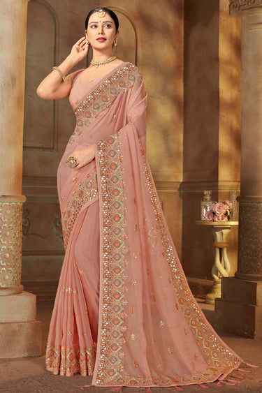Festival Wear Chiffon Fabric Peach Color Magnificent Saree With Embroidered Work