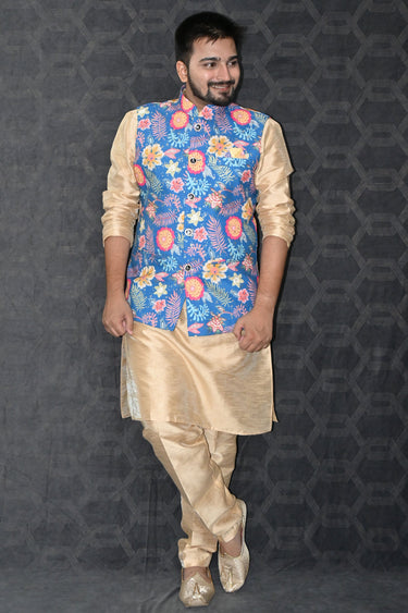 Step into your reception with grandeur by donning our beautiful Golden Kurta Pyjama set for men. It is crafted from premium quality Art Silk fabric that promises comfort as much as it does style. The ready-to-wear ensemble includes a sumptuously designed three-piece jacket set that amplifies its aesthetic appeal. Wear it, flaunt it, and become the epitome of opulent charm at your function.