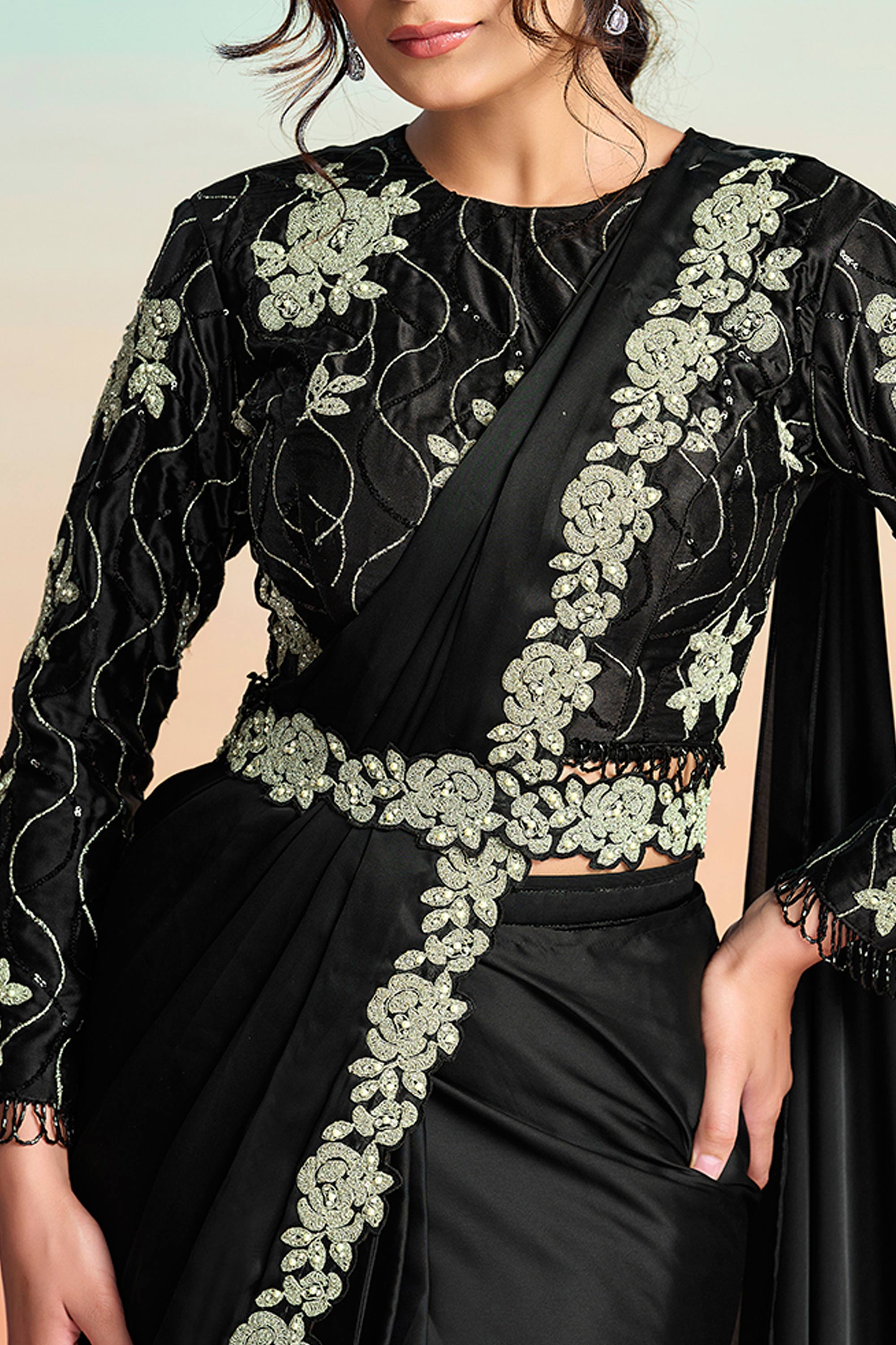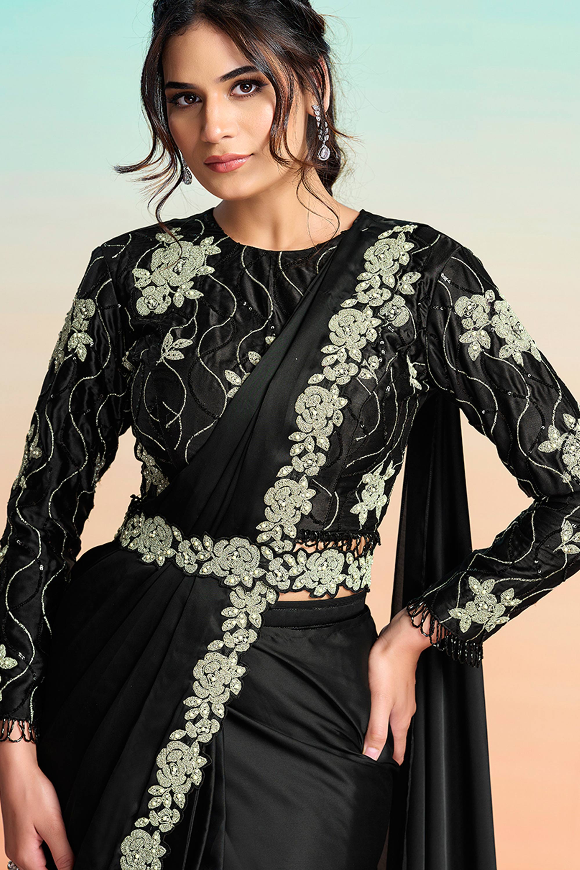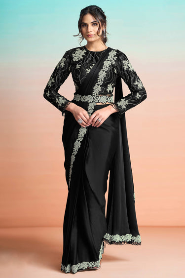 Festive Wear Black Satin Silk Pre Draped Saree With Heavy Embroidery And Modern Blouse