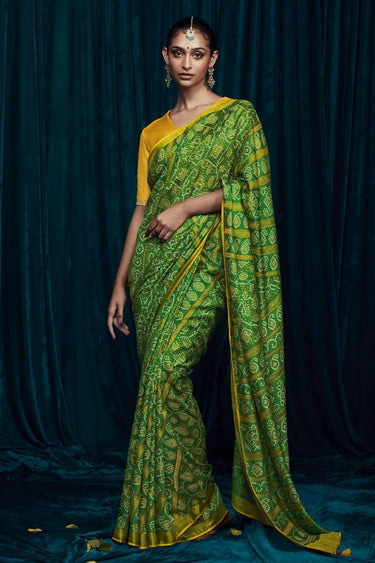 Festive Wear Brasso Silk Fabric Printed Saree In Green Color