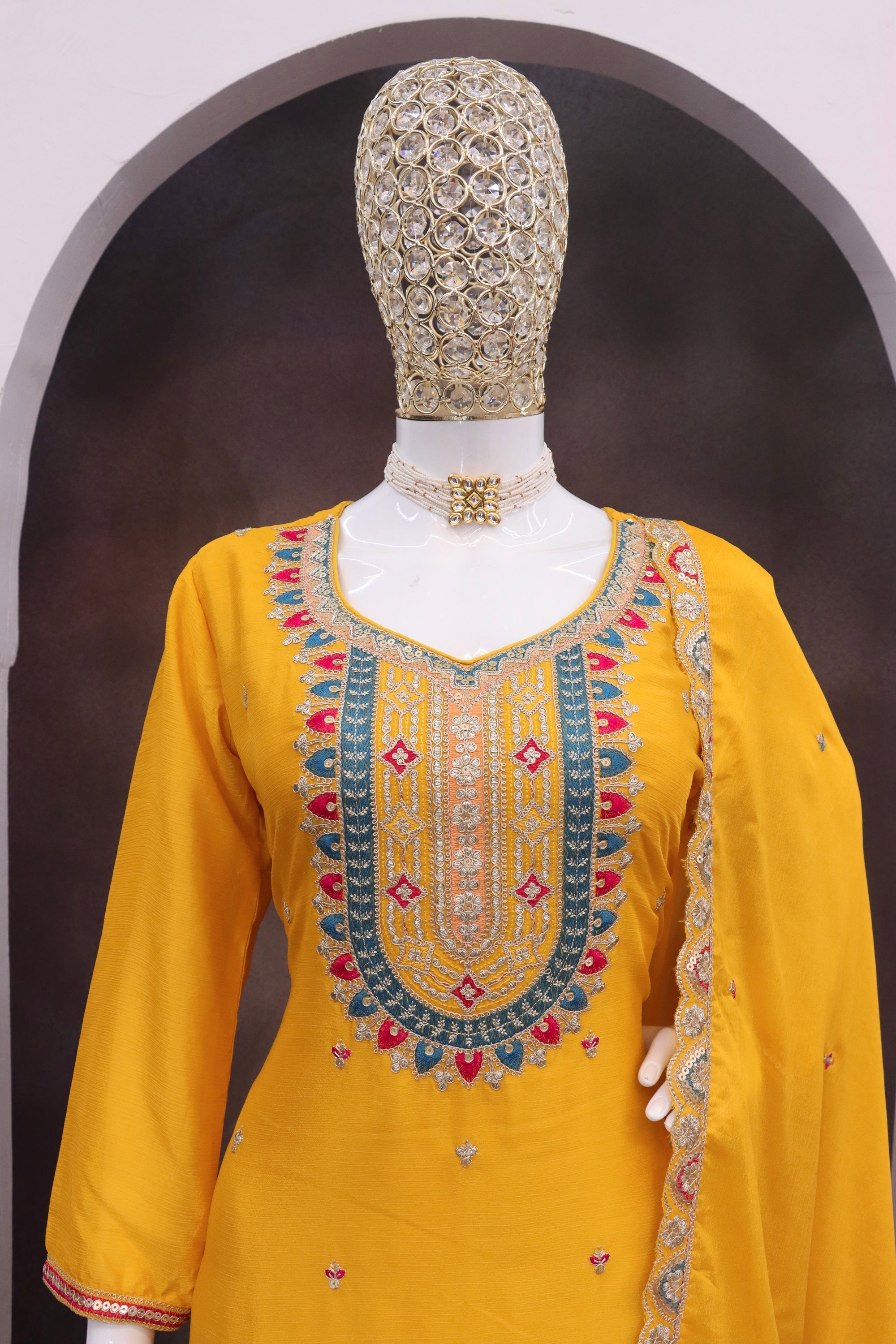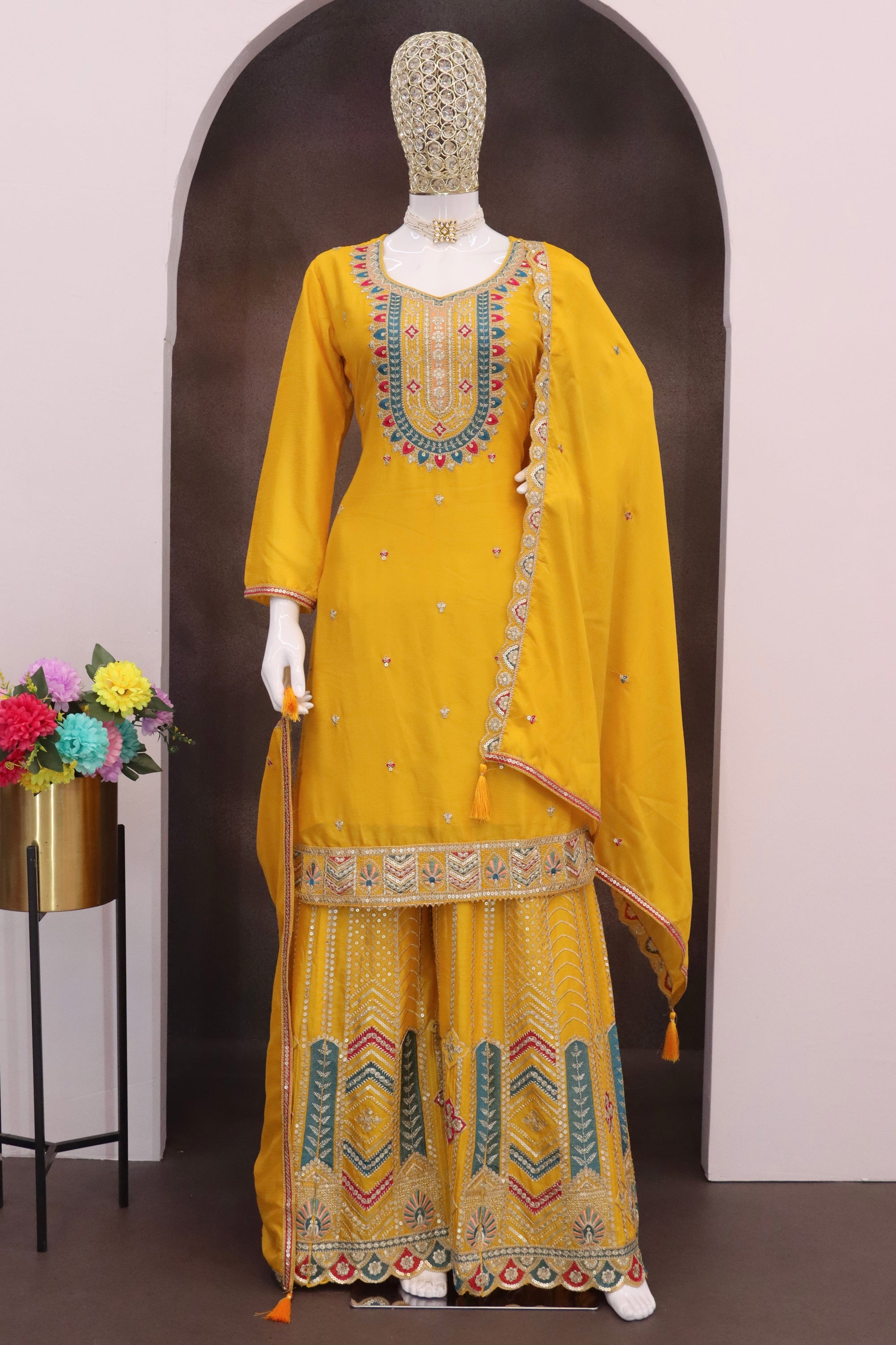 Festive Wear Chinon Yellow Designer Readymade Palazzo Dress