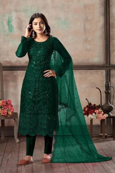 Festive Wear Dark Green Color Net Fabric Classy Embroidered Straight Cut Dress