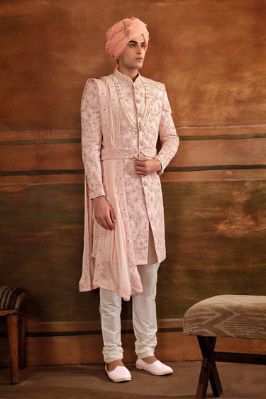 Fetching Pink Silk Fabric Wedding Wear Heavy Embroidered Groom Sherwani For Men With Stole