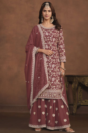 Function Wear Brown Attractive Embroidery Work Palazzo Dress In Georgette Fabric