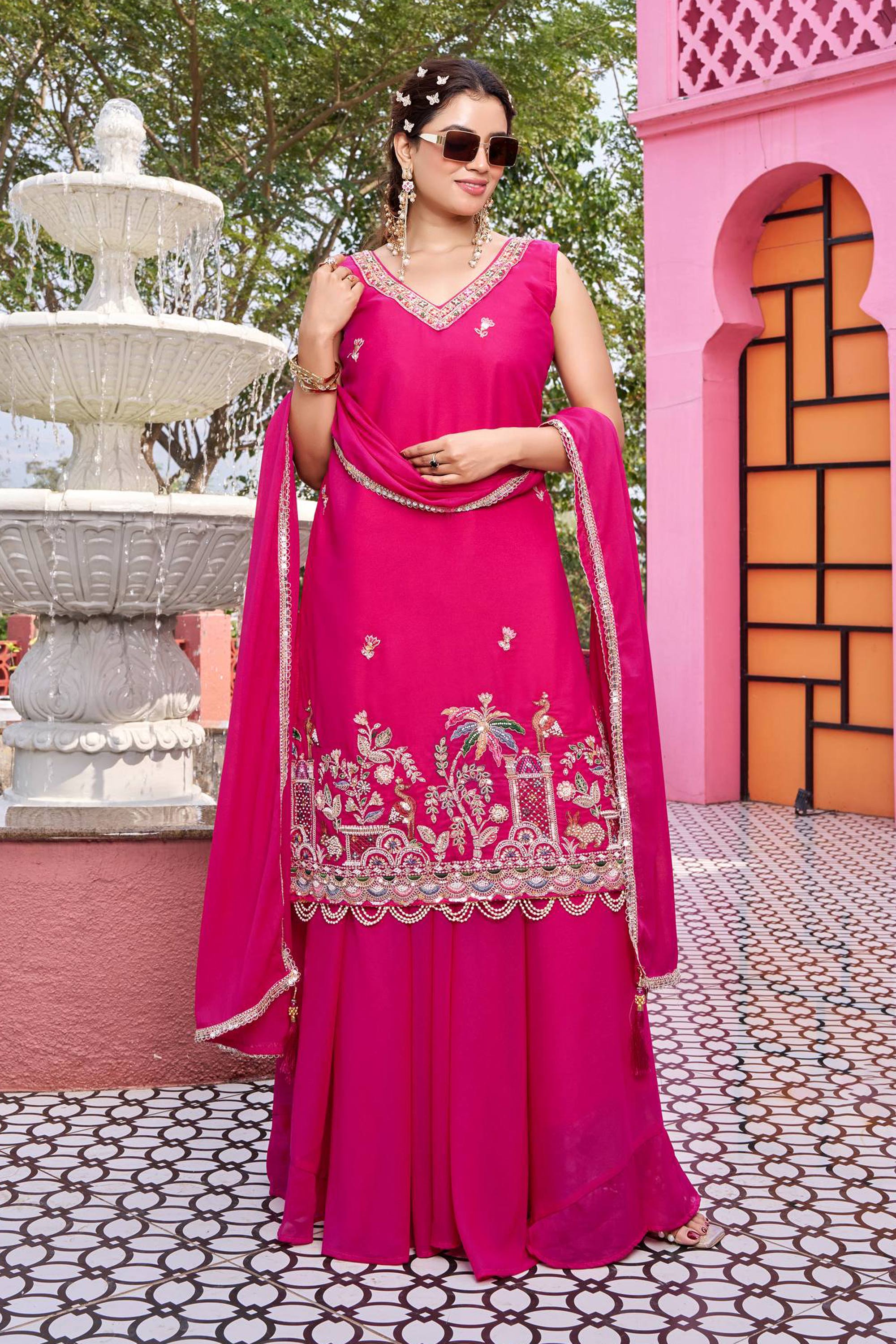 Georgette Embroidered Pink Readymade Palazzo Suit For Sangeet Wear