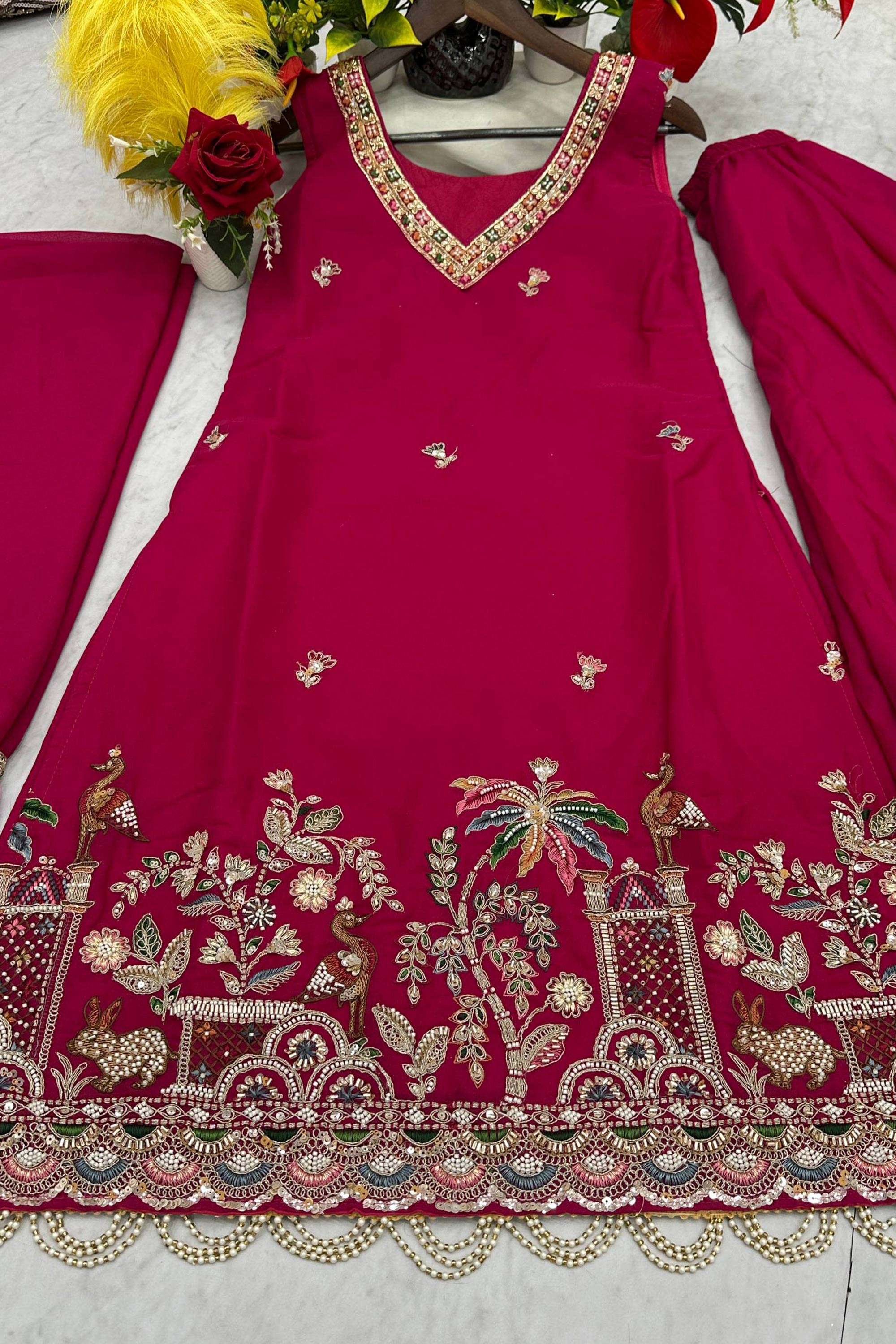 Add a touch of refined elegance to your celebration wardrobe with this beautiful Salwar Kameez Palazzo Suit, designed to make you shine at special occasions. The top is crafted from soft and flowy georgette fabric, enhanced with exquisite embroidery work that brings out a festive and sophisticated charm. Note: Due to digital photography, slight color variations may occur.