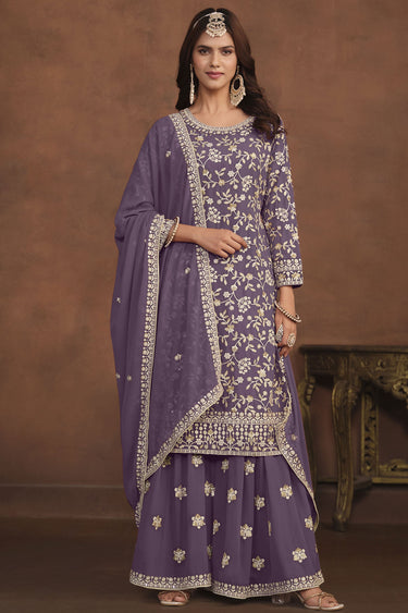 Georgette Embroidery Work Function Wear Stylish Palazzo Salwar Suit In Purple Color