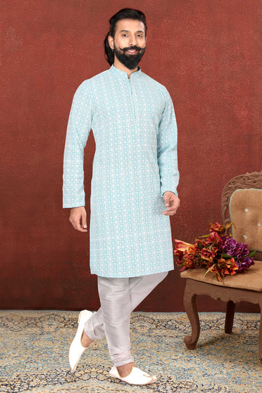 Georgette Fabric Cyan Color Festive Wear Readymade Men Stylish Kurta Pyjama