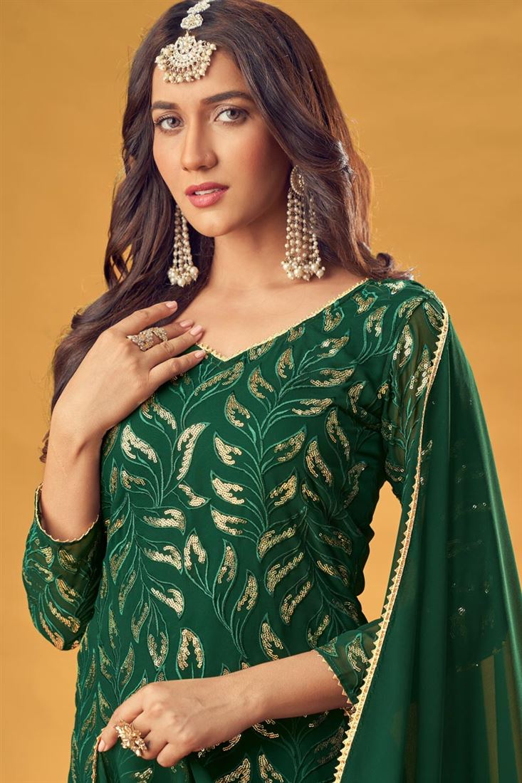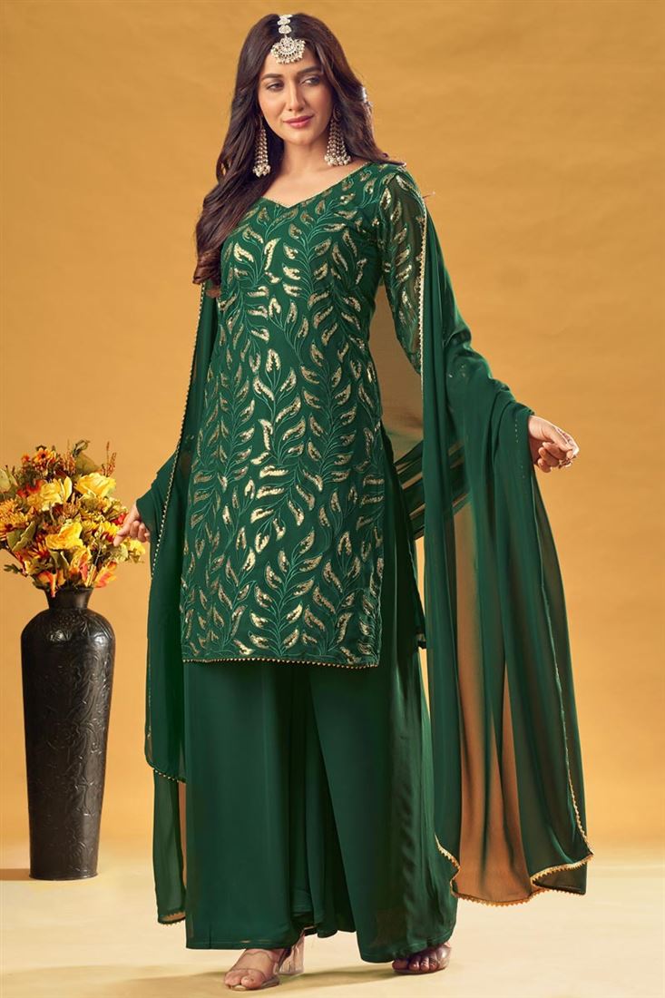 Georgette Fabric Dark Green Color Spectacular Embroidered Work Sangeet Wear Palazzo Suit