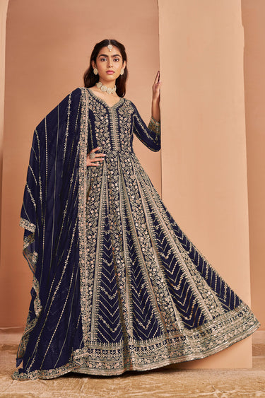 Georgette Fabric Embroidered Anarkali Dress In Navy Blue Color