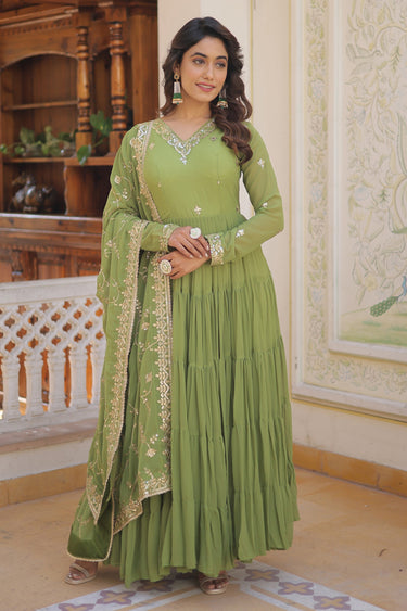 Georgette Fabric Green Color Embroidered Readymade Anarkali Style Long Gown With Dupatta