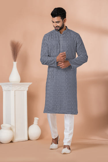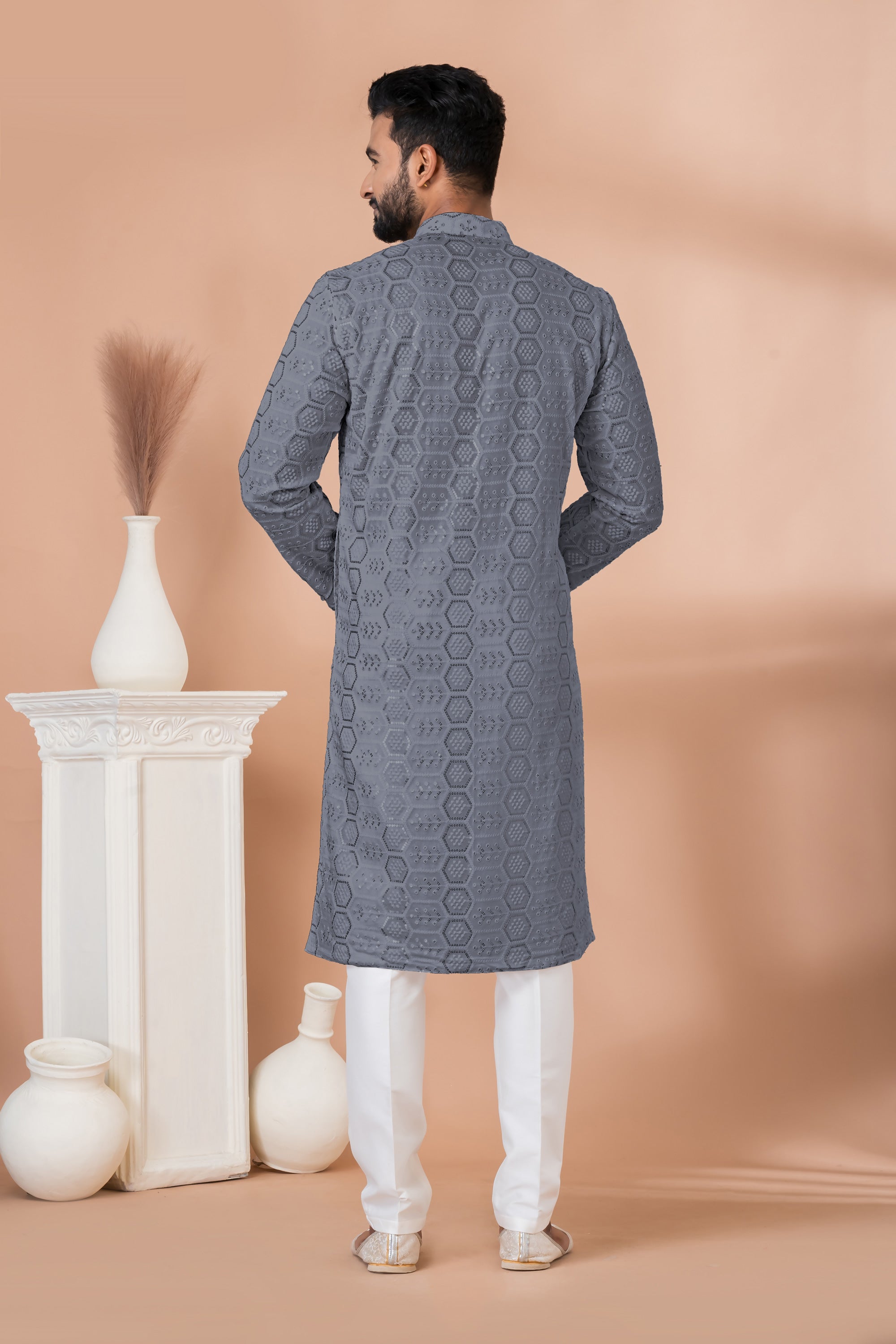Georgette Sequins Embroidery Grey Magnificent Readymade Men Kurta Pyjama For Sangeet Wear