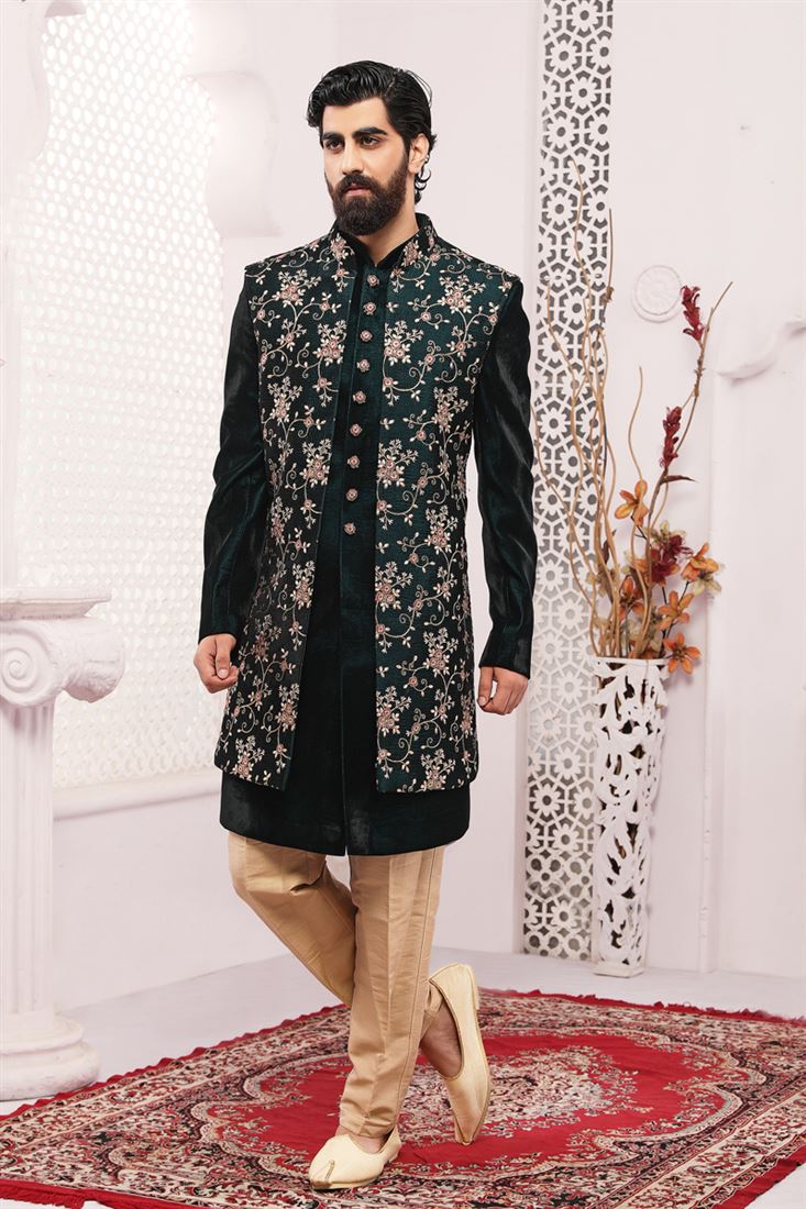 Glamorous Dark Green Color Velvet Fabric Embroidered Work Wedding Function Readymade Trendy Indo Western For Men