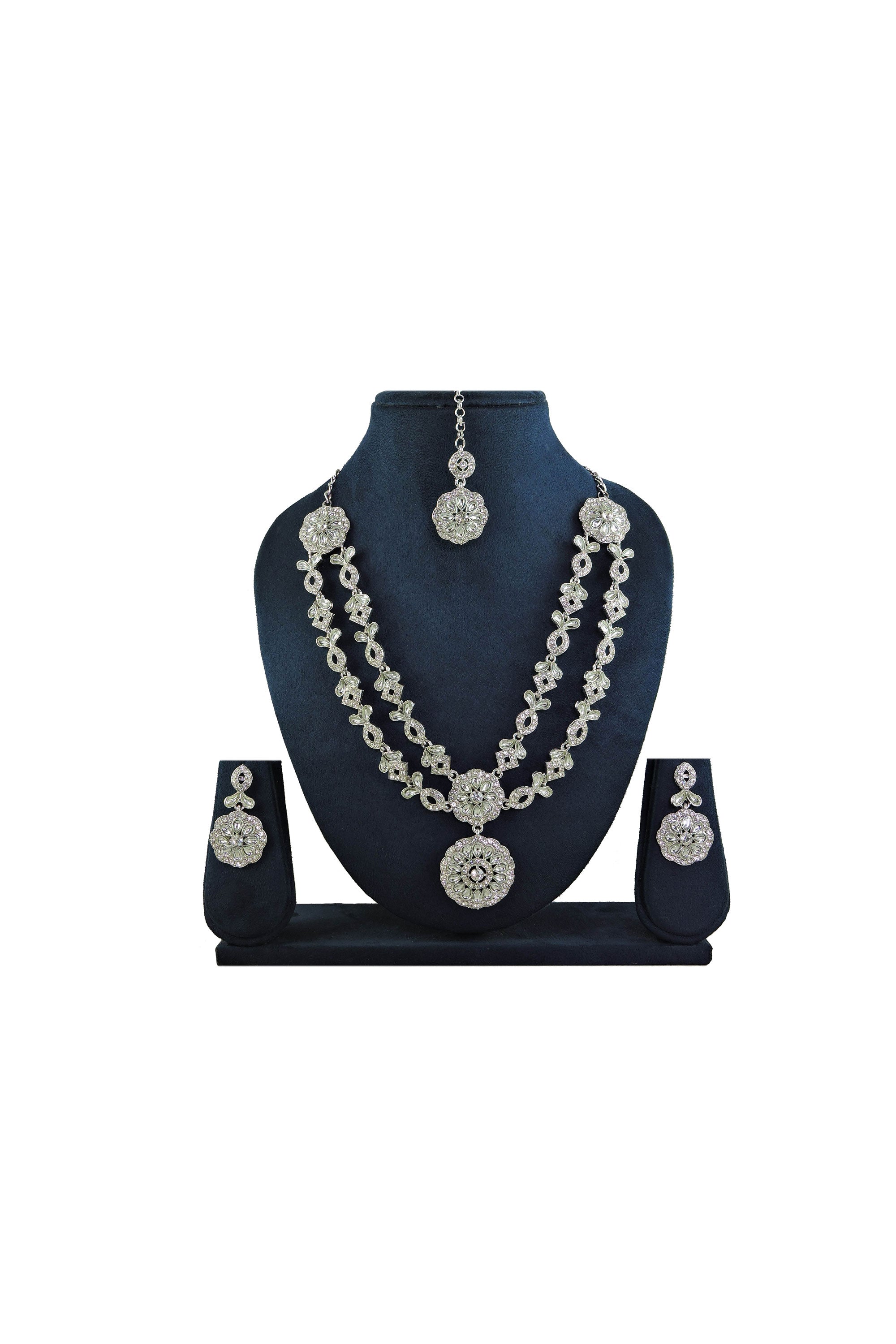 Glamorous Necklace Set Earrings And Mang Tikka For Women In White Color Alloy Material