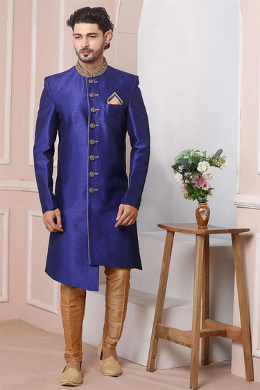 Gorgeous Blue Color Banarasi Silk Fabric Wedding Wear Indo Western For Men