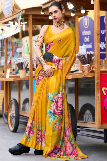 Gorgeous Look Floral Printed Saree In Yellow Georgette Fabric