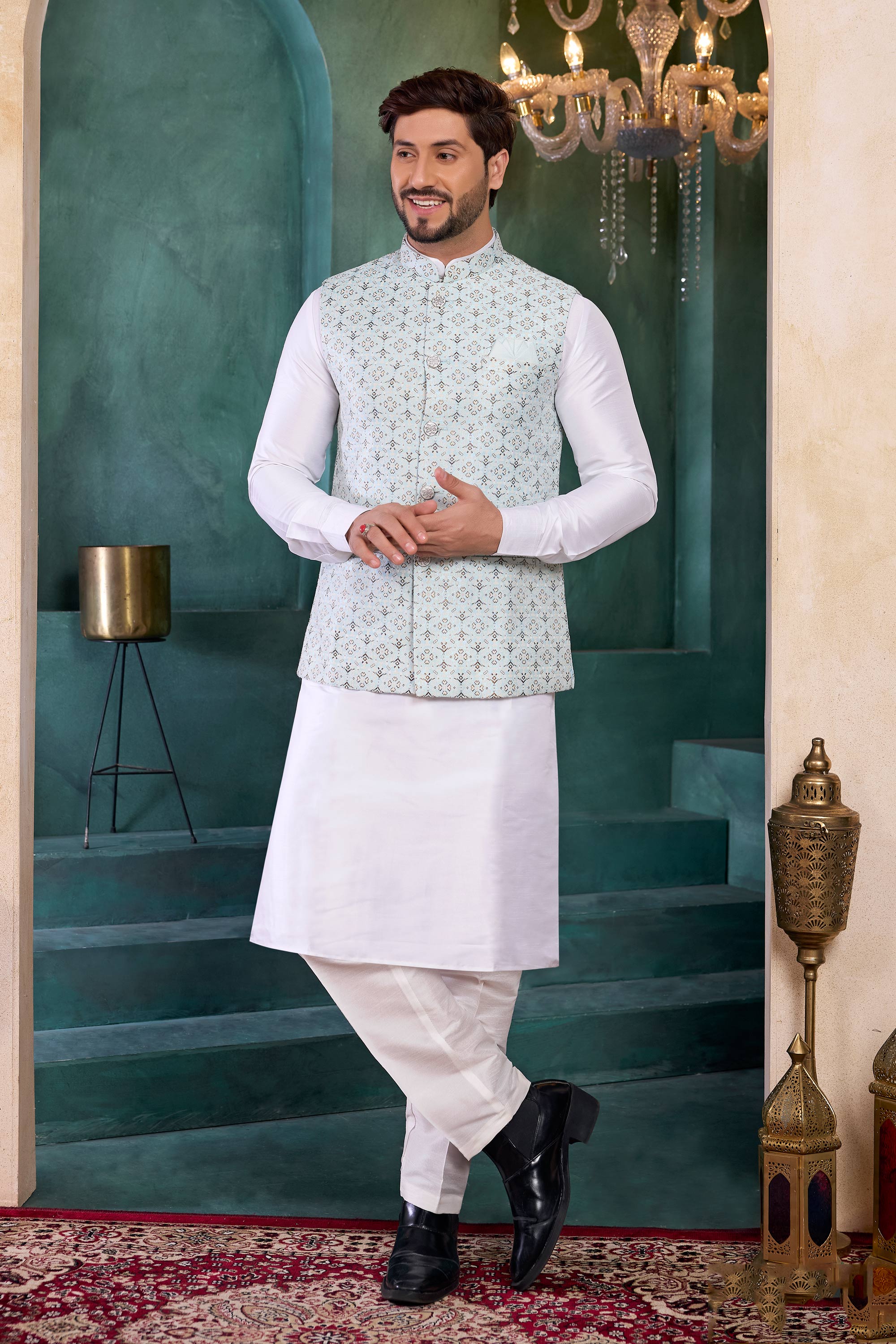 Look your absolute best with this exclusive Wedding Function Designer Readymade Mens 3-Piece Kurta and Jacket with Aligadhi Pant. Designed with premium-quality materials, this outfit brings together tradition and modern fashion in one stunning package. The stylish jacket is paired with a comfortable kurta and expertly tailored Aligadhi pants, creating a look perfect for weddings, receptions, or other formal events. This attire ensures unmatched comfort while exuding charm and sophistication. Whether you're the groom, a guest, or celebrating any occasion, this ready-to-wear ensemble promises an effortlessly dapper look.