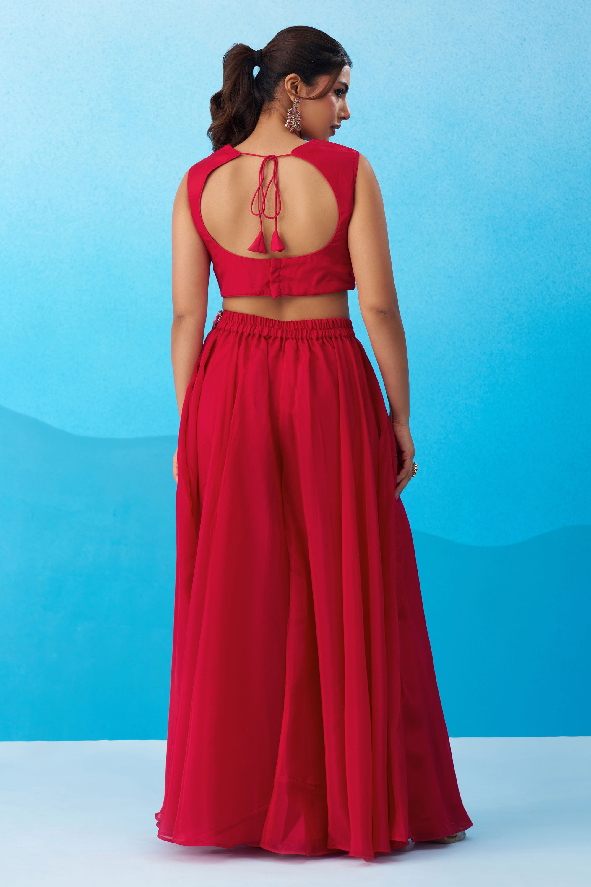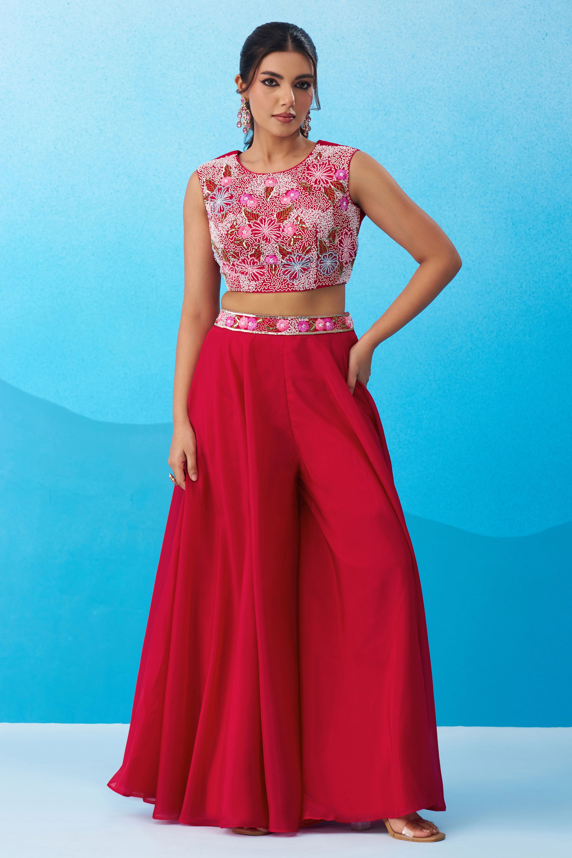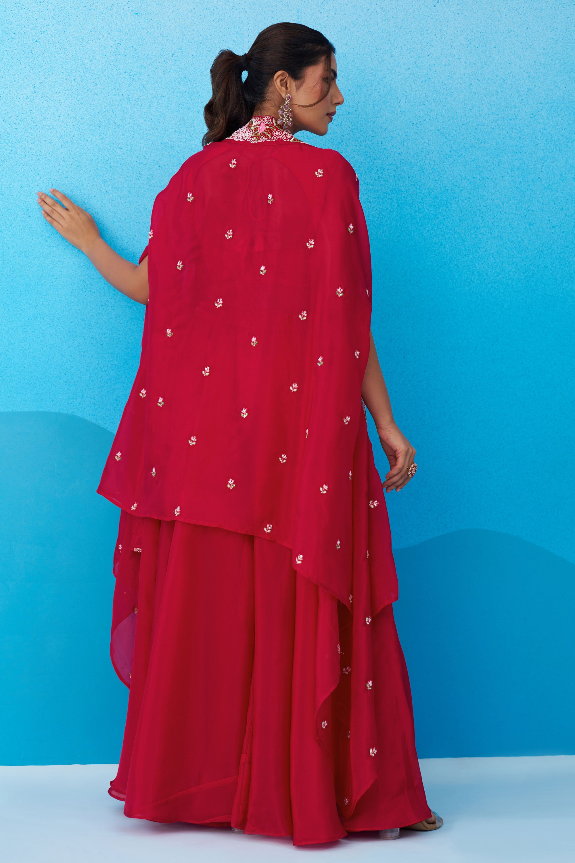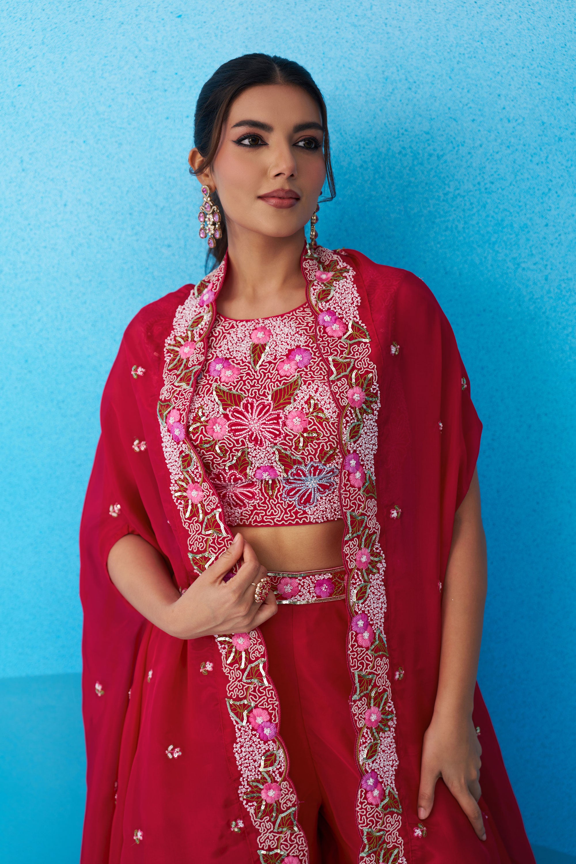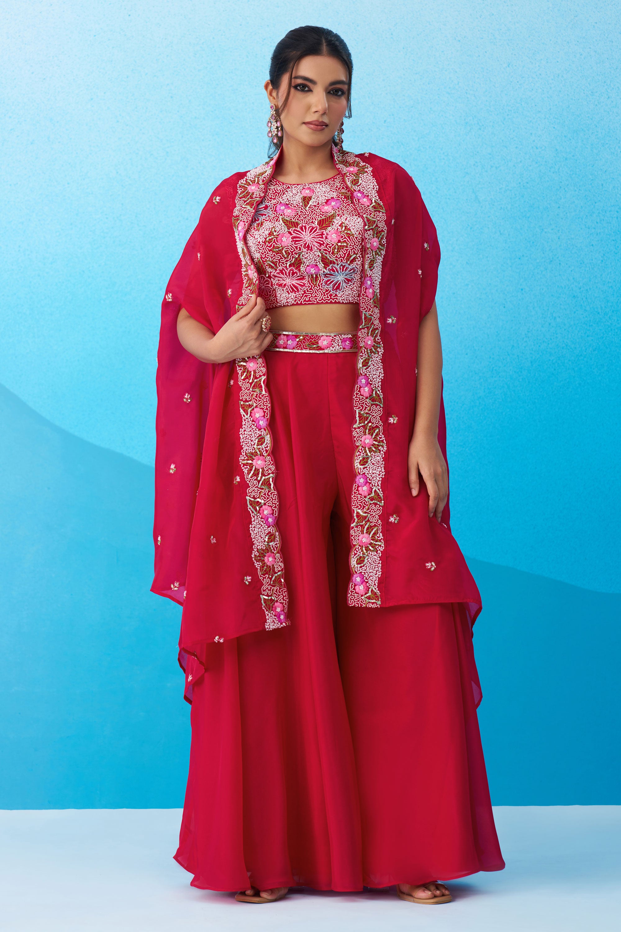 Graceful Rani Crepe Embroidered Indo Western Crop Top With Palazzo And Flared Cape