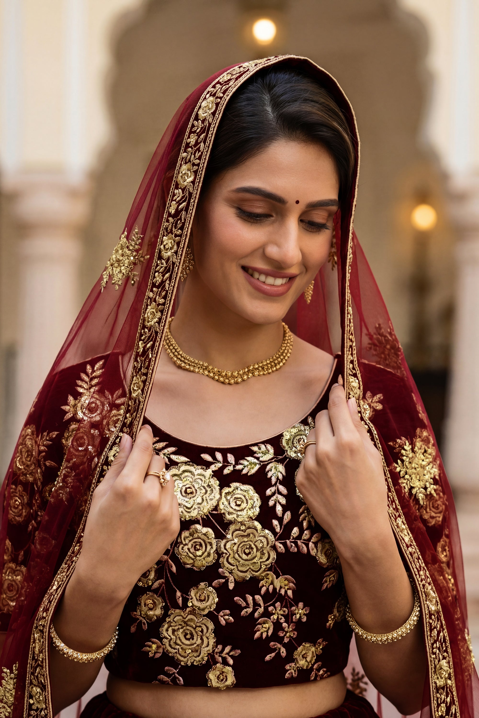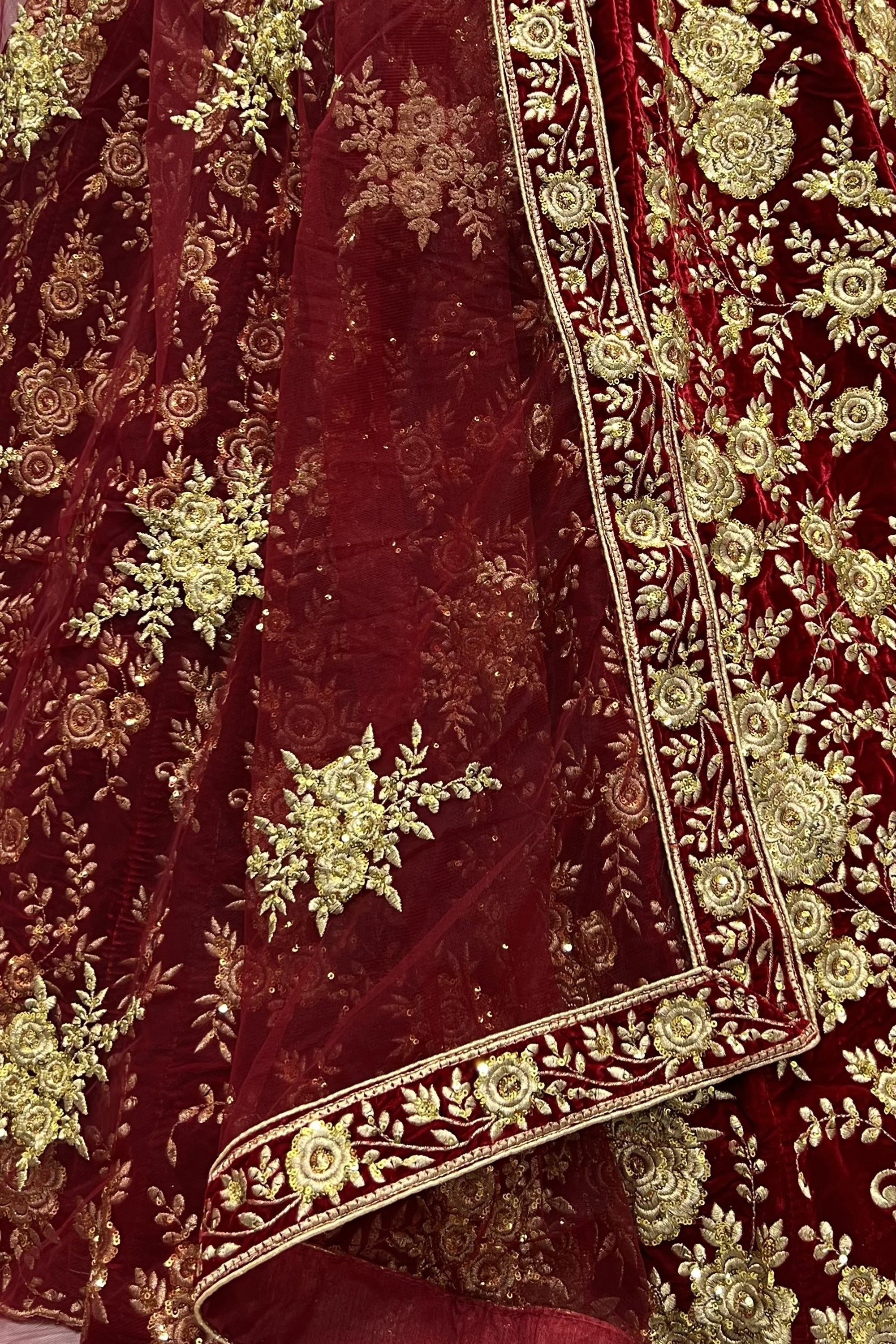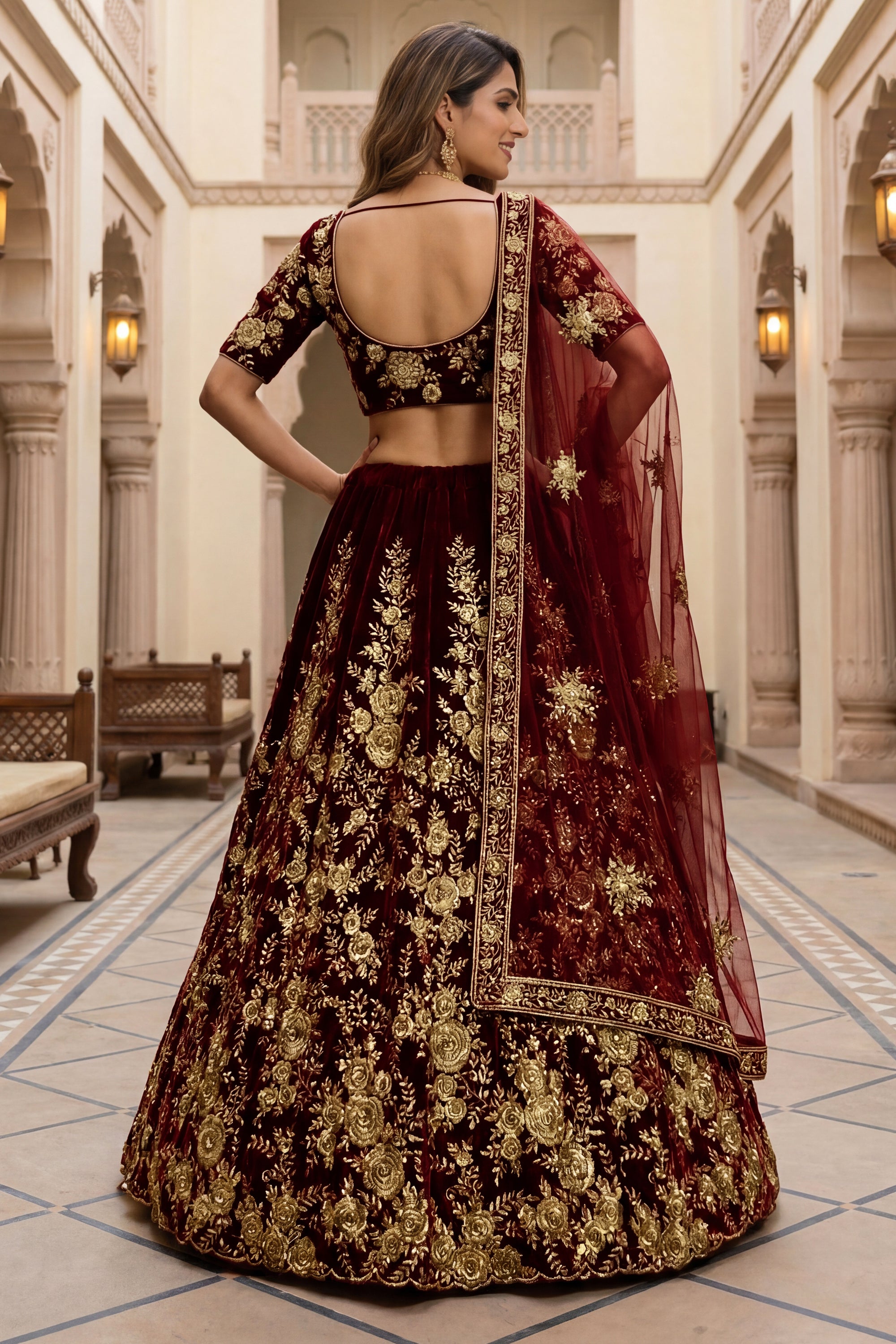 Grand Maroon Wedding Special Designer Embroidered Velvet Lehenga Choli