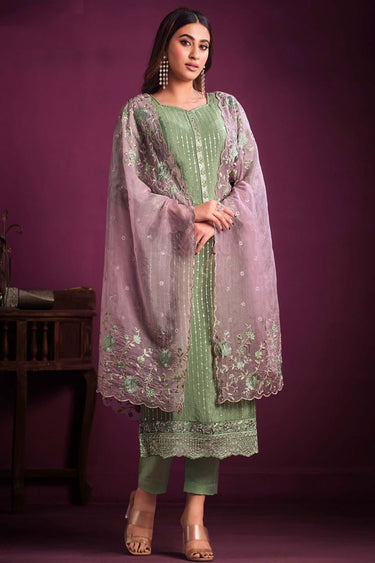 Crafted with utmost care and attention to detail, this Green Salwar Suit is made from high-quality Chinon fabric. Chinon fabric is known for its elegant drape, smooth texture, and luxurious feel, ensuring both comfort and style.