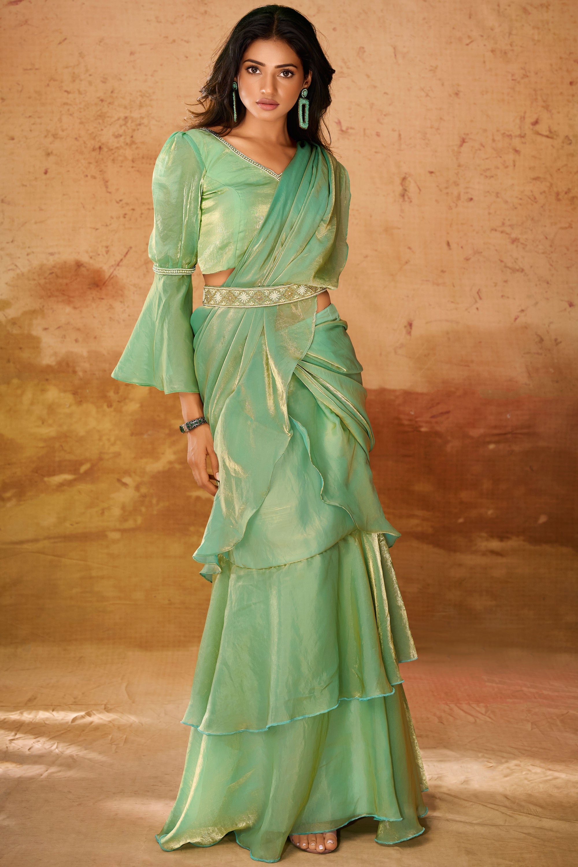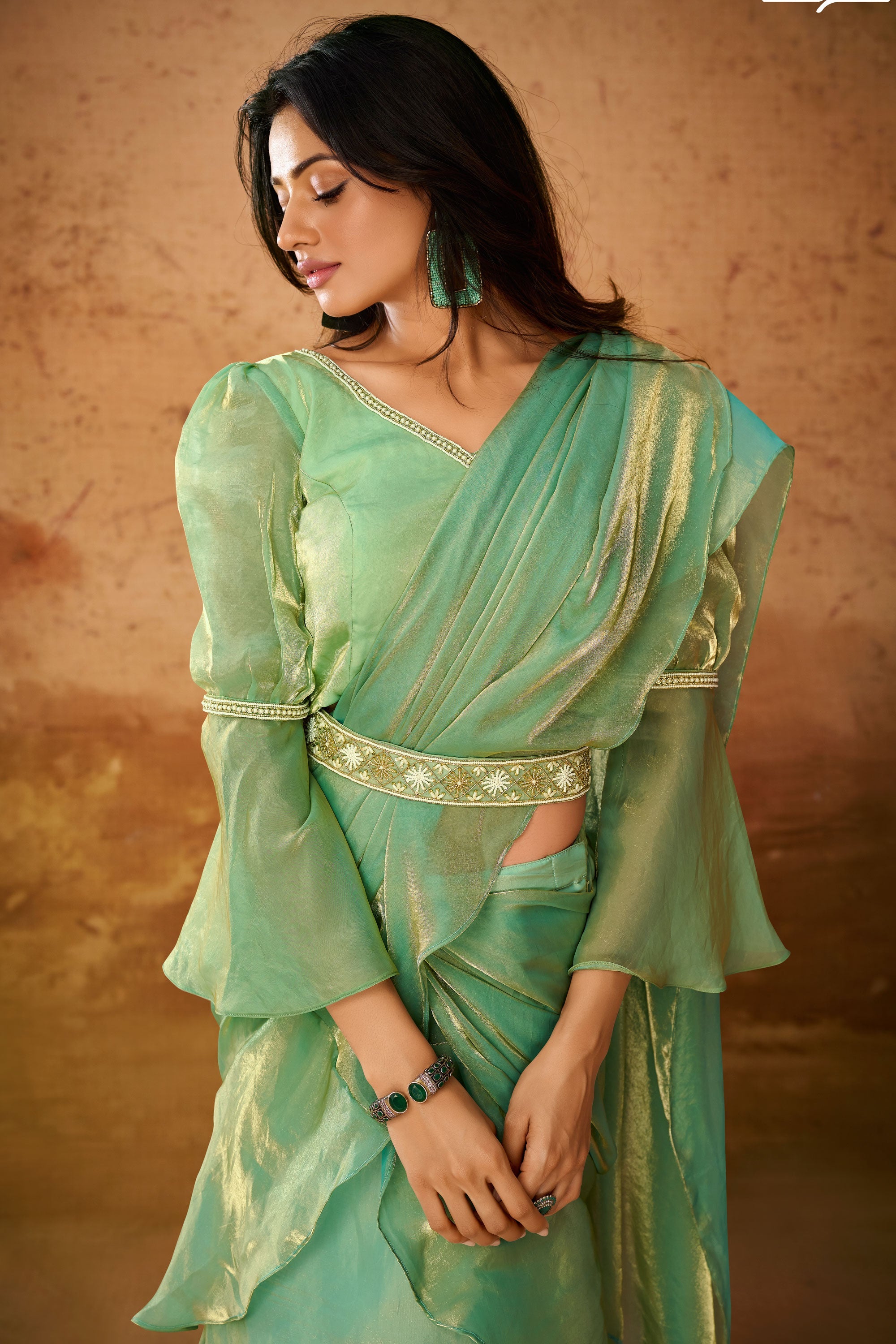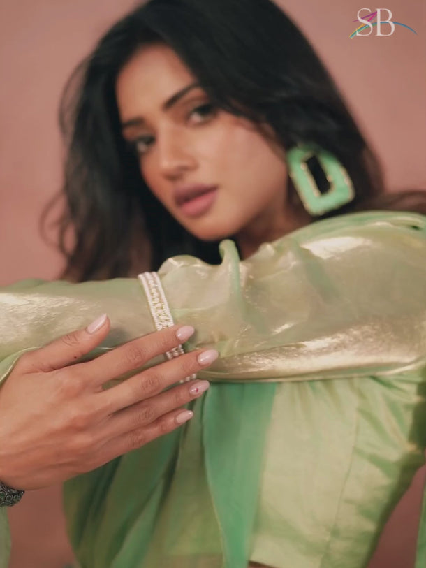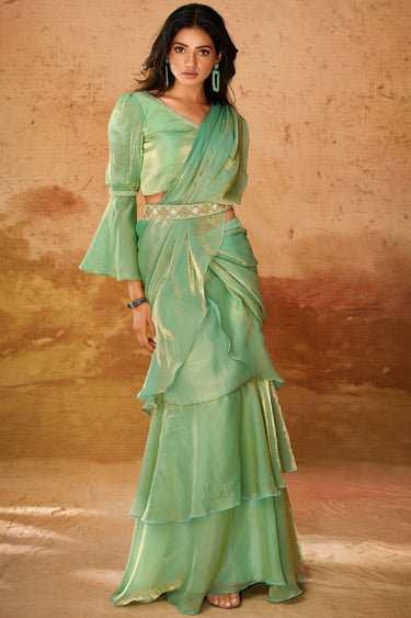 Green Color Exquisite Hand Work Function Wear Organza Saree