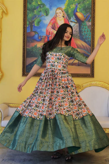 Green Color Glorious Patola Printed Gown In Art Silk Fabric
