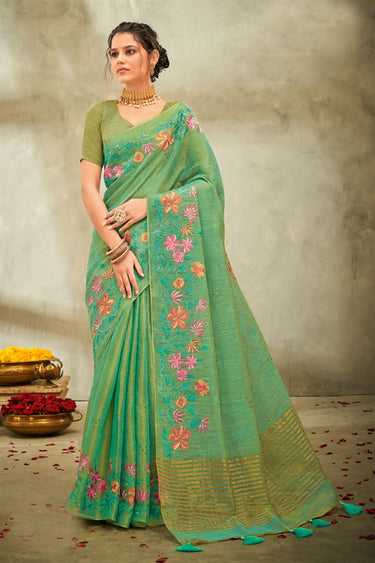 Green Color Linen Fabric Beautiful Floral Embroidered Saree