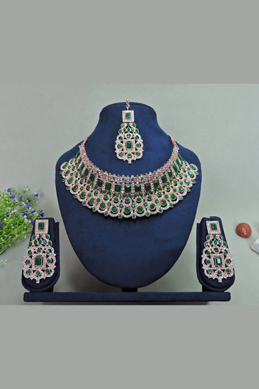 Green Color Patterned Alloy Necklace With Earrings and Mang Tikka