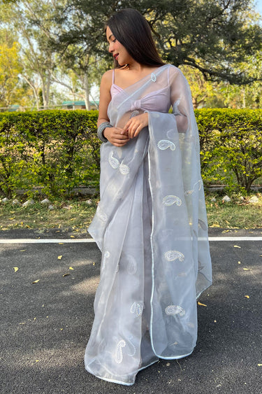 Grey Organza Embroidery Work Saree With Blouse