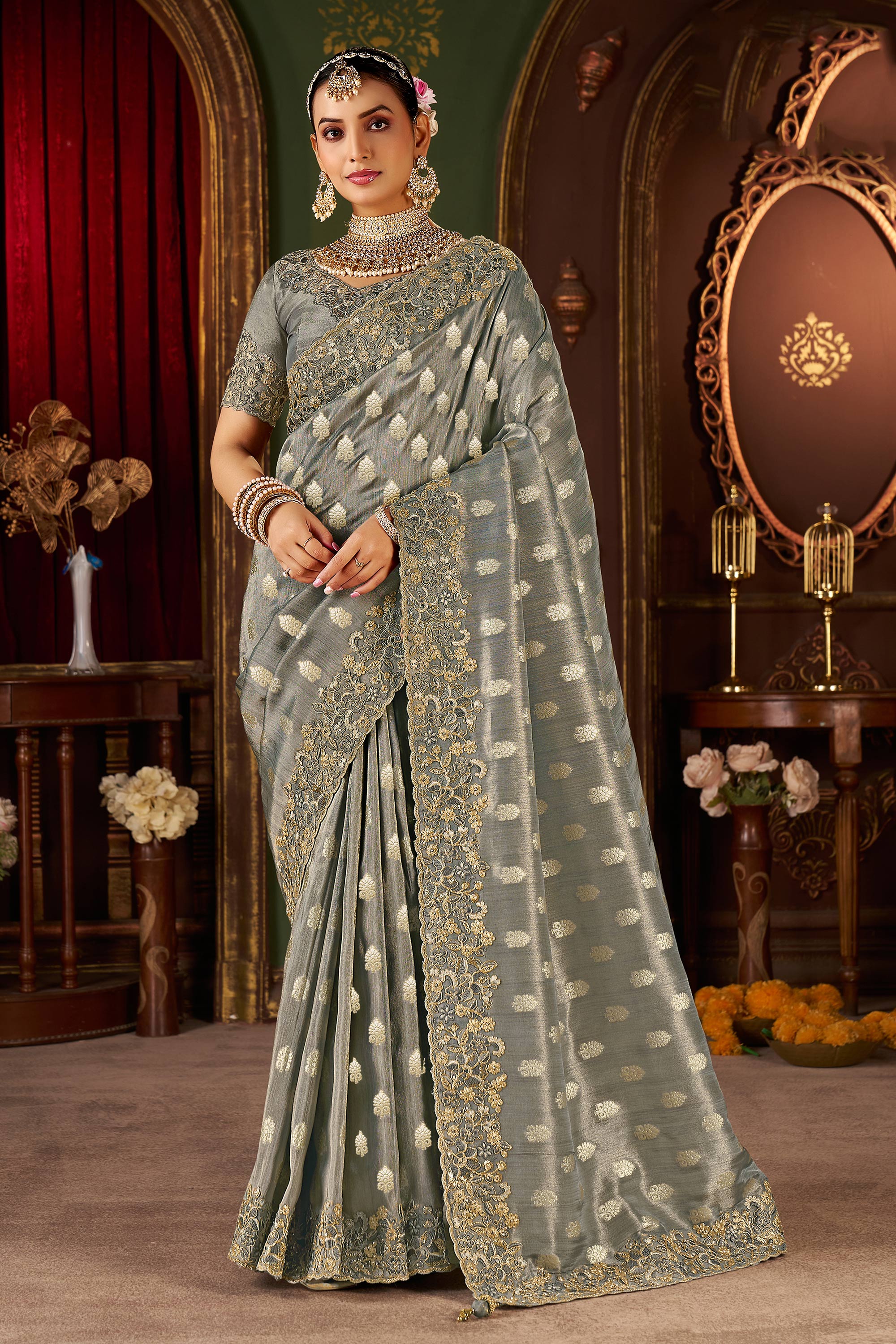 Grey Wedding Wear Art Silk Embroidered Border Work Saree