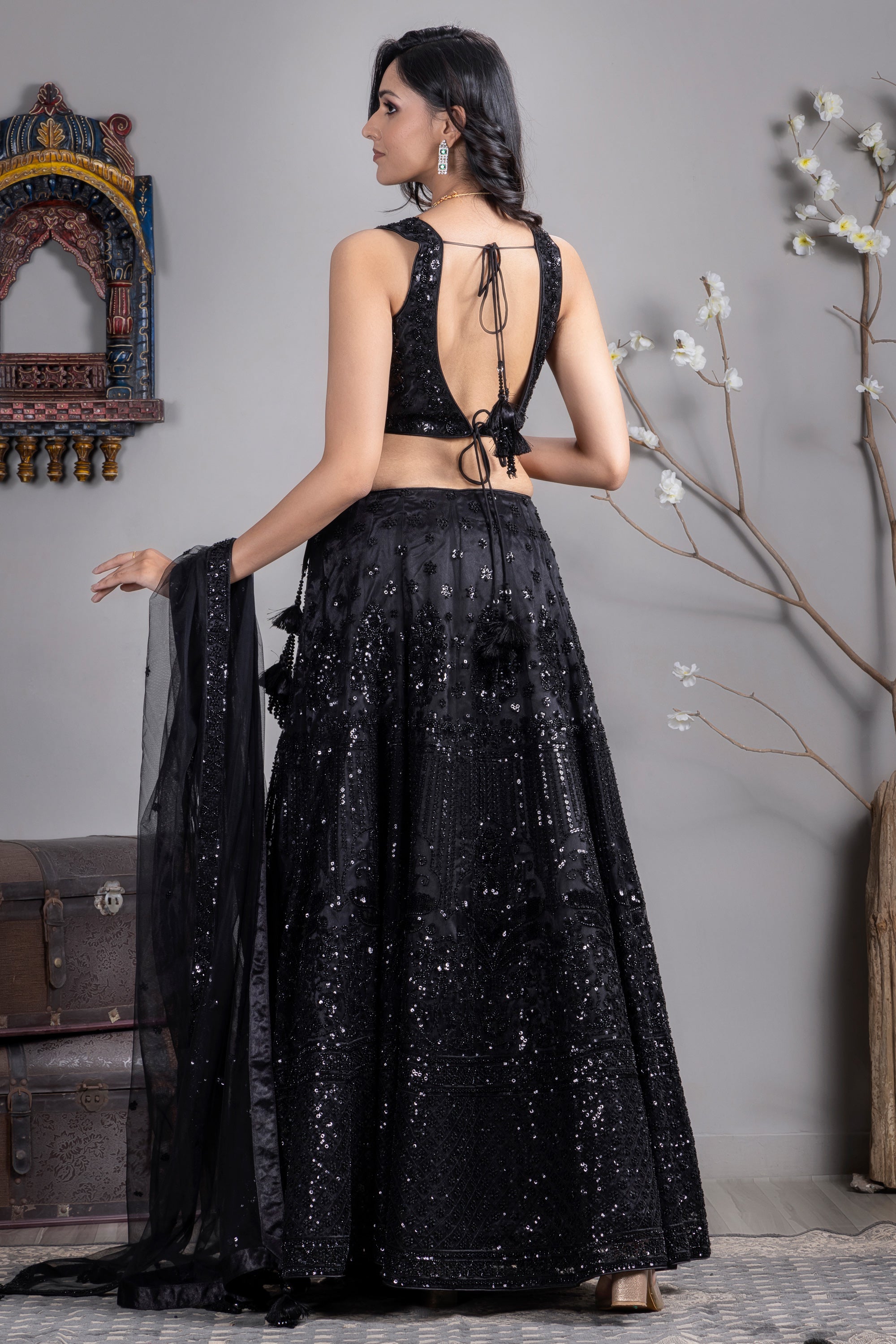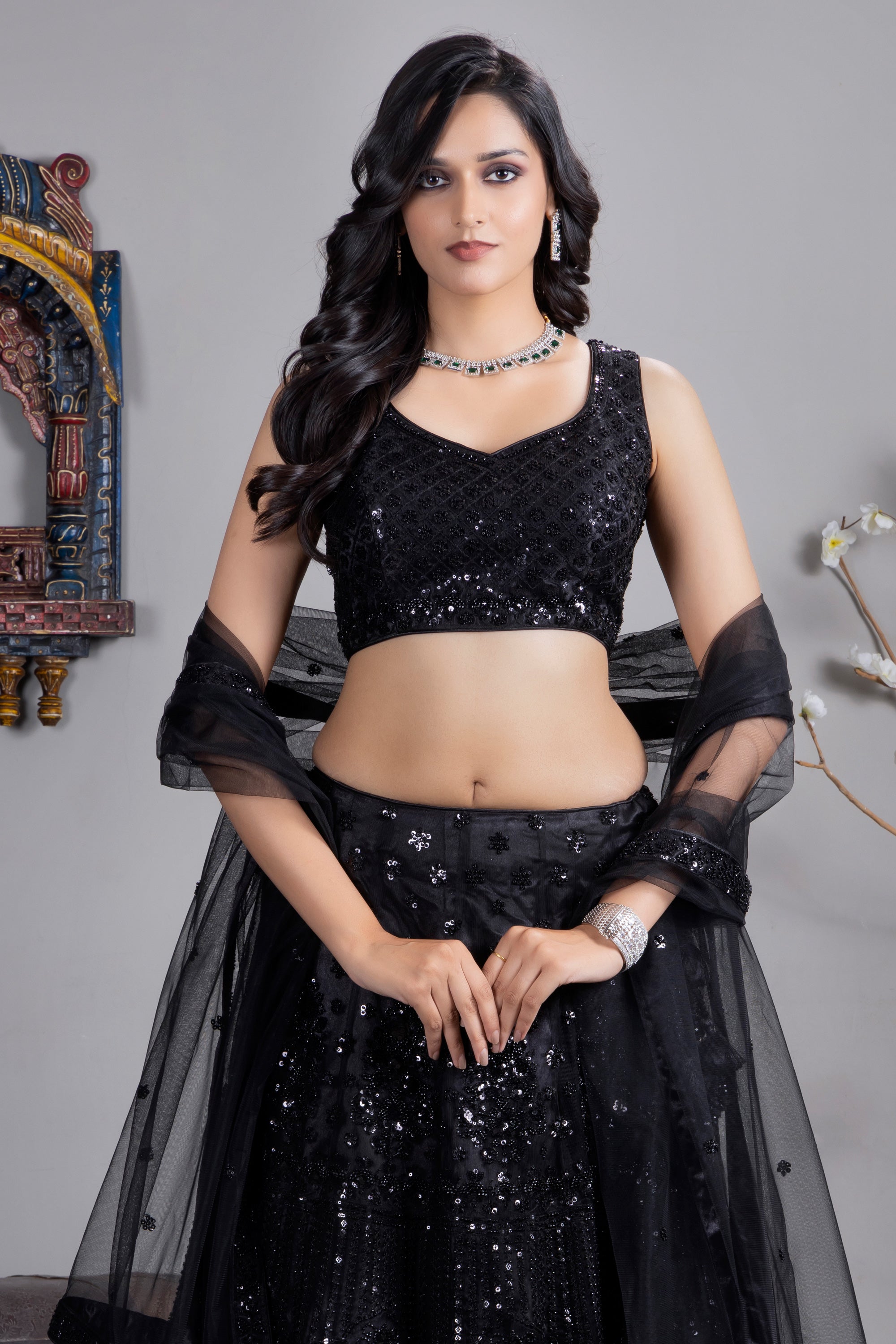 Stand out at your next special occasion with this elegant black Lehenga Choli made from luxurious satin silk fabric. Adorned with intricate heavy sequin work, this ensemble exudes sophistication and charm. The choli fits comfortably, offering a flattering silhouette, while the flared lehenga provides a graceful flow. Perfect for weddings, festivals, and evening events, this traditional yet contemporary attire will surely make heads turn. Pair it with statement jewelry to complete your look.