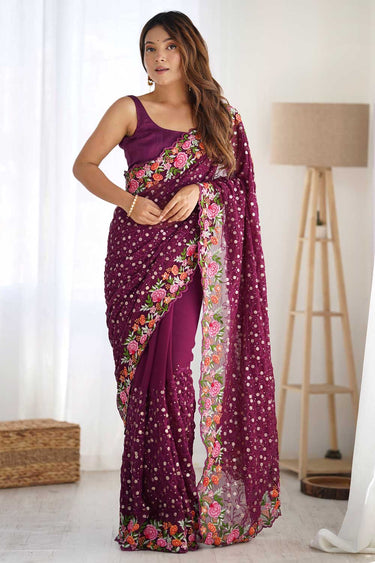 Dazzle at every festive occasion with this elegant Georgette Saree, featuring stunning sequin and multi-thread embroidery work. Paired with a luxurious Diamond Silk blouse (0.80 mtr), this 5.5-meter saree ensures you shine with sophistication and charm. Note: Slight color variations may occur due to digital photography.