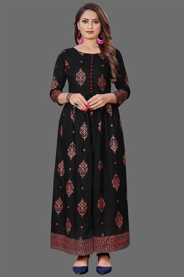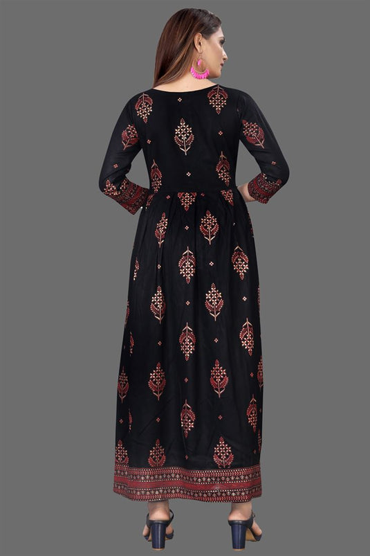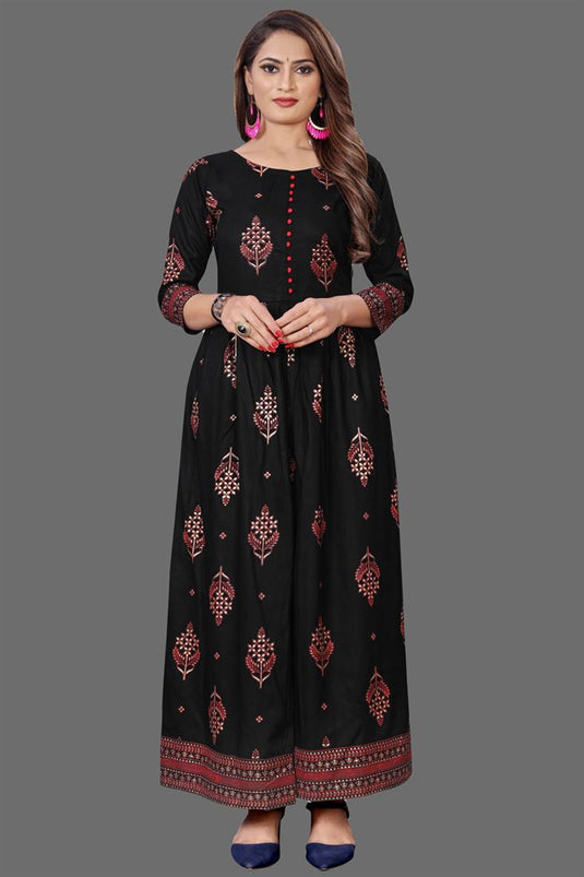 Imposing Black Color Rayon Fabric Casual Wear Stunning Foil Printed Work Readymade Kurti