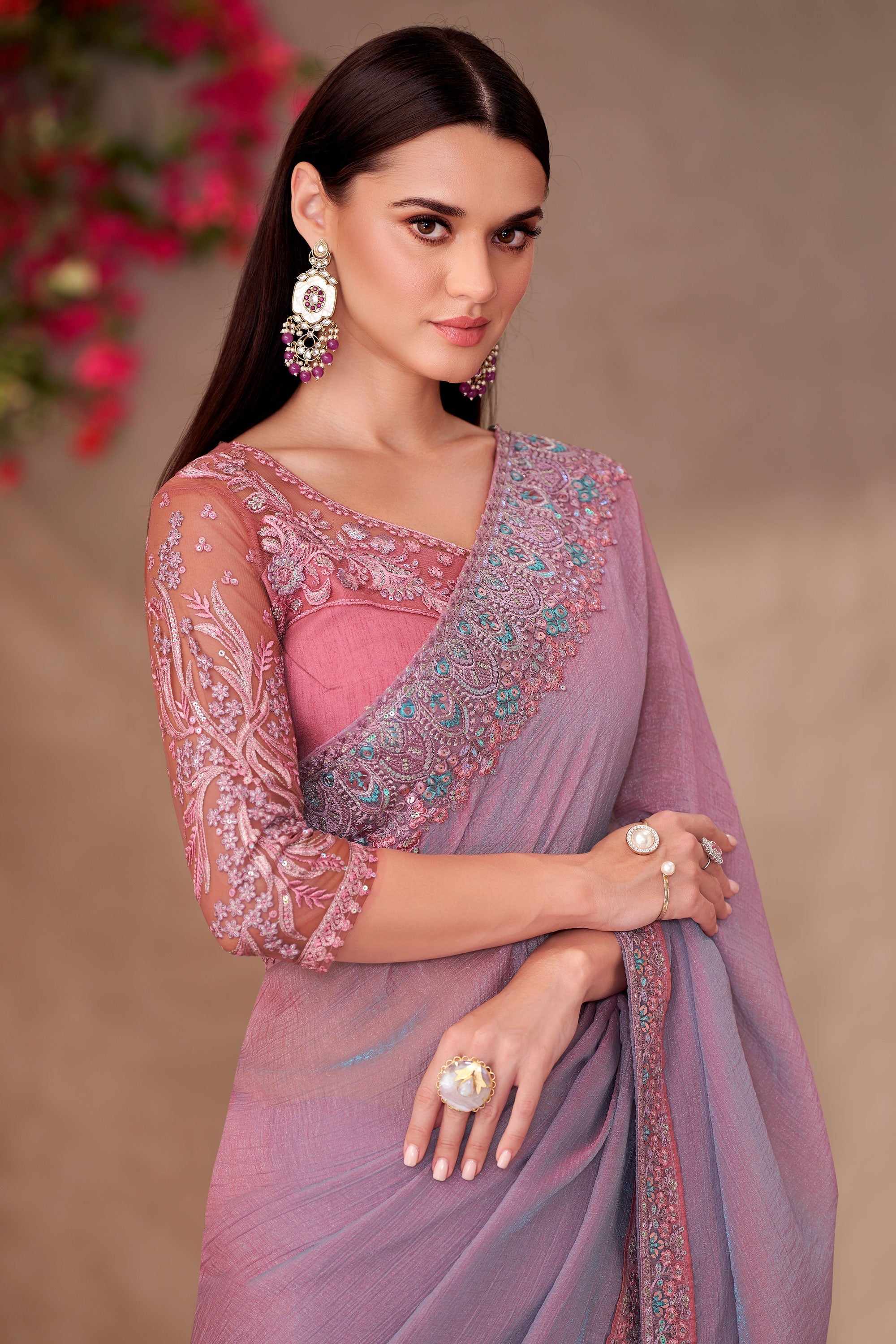 Incredible Border Work On Georgette Fabric Lavender Color Saree