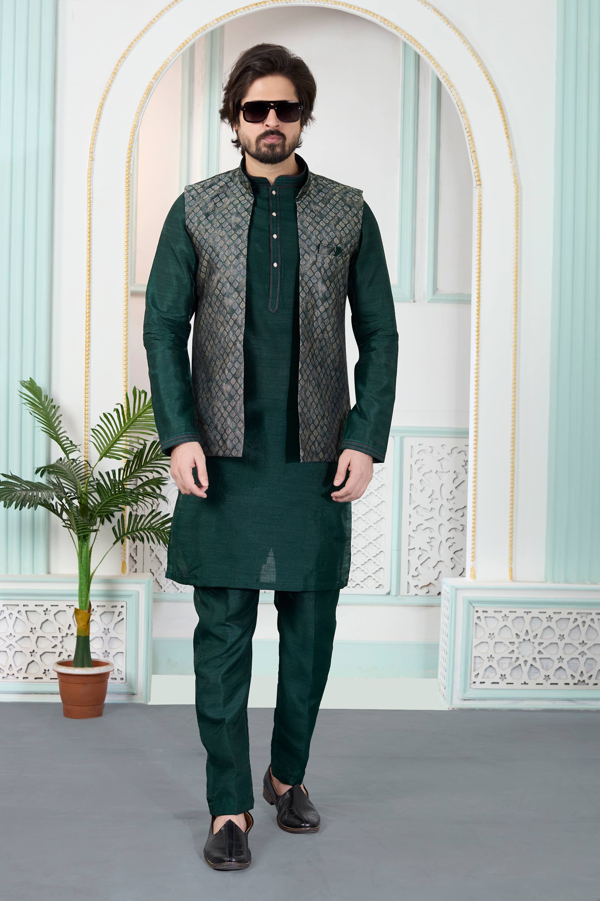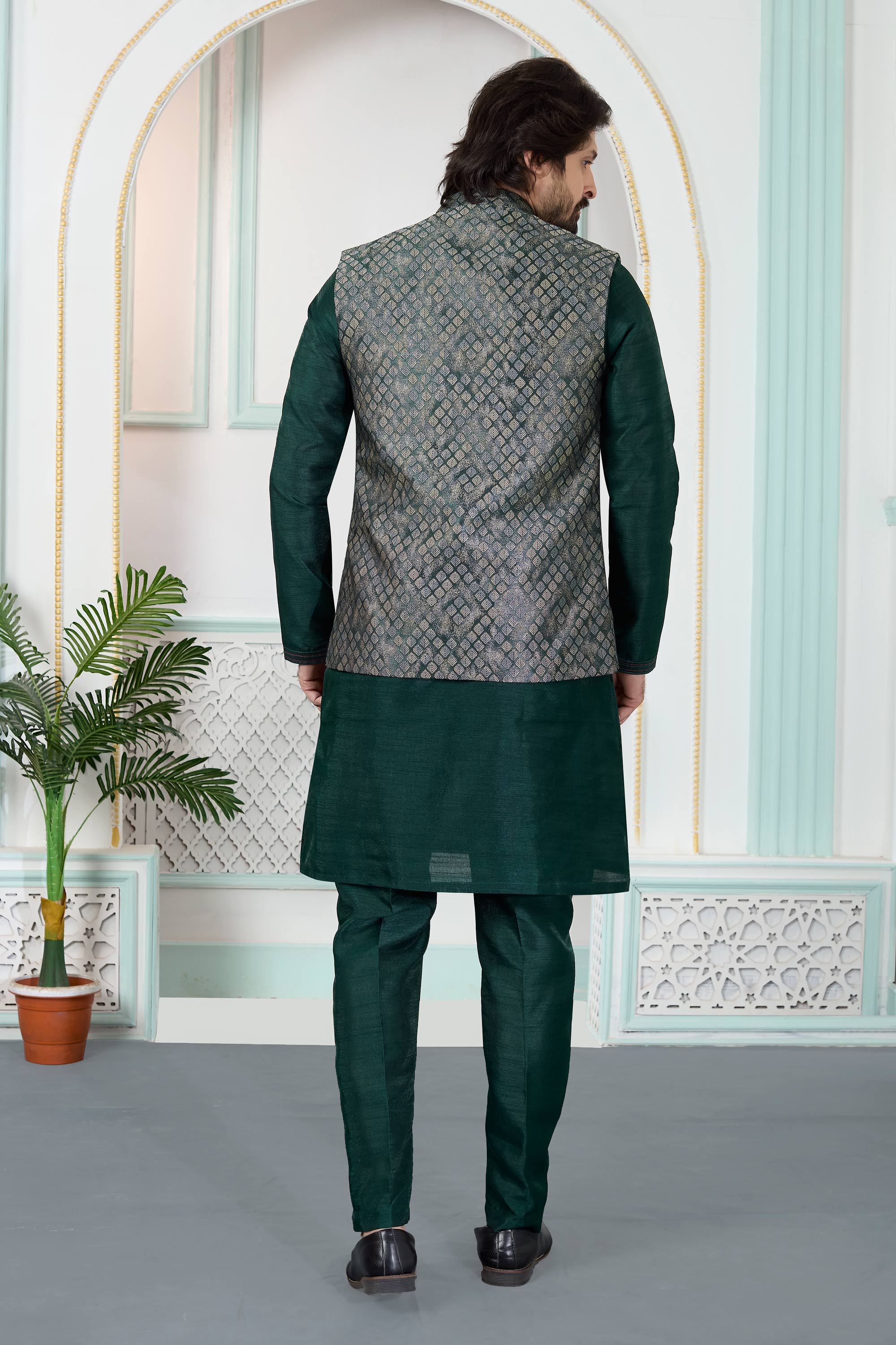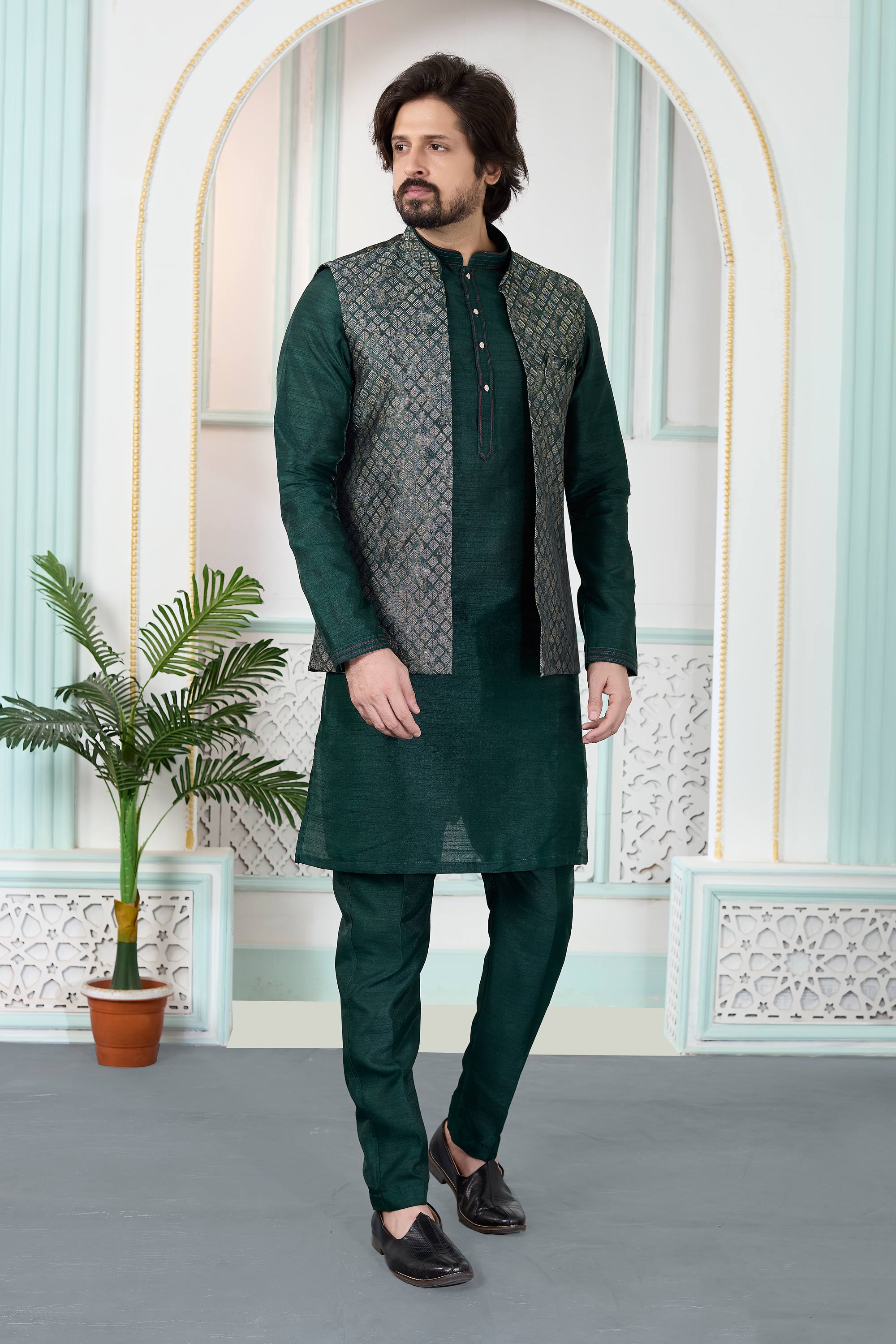 Jacquard Dark Green Wedding Wear Readymade Kurta And Aligadhi Pant With Jacket For Men