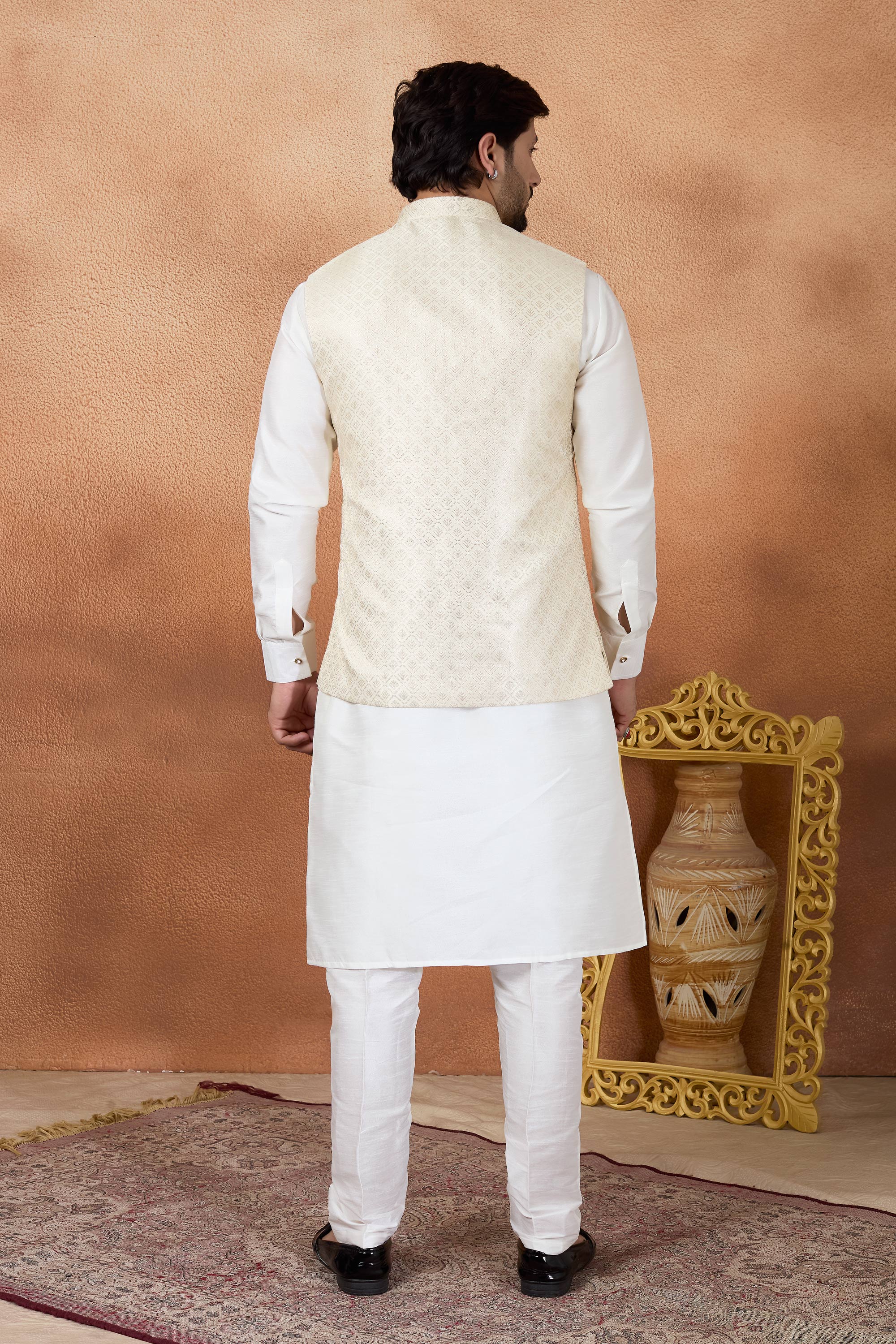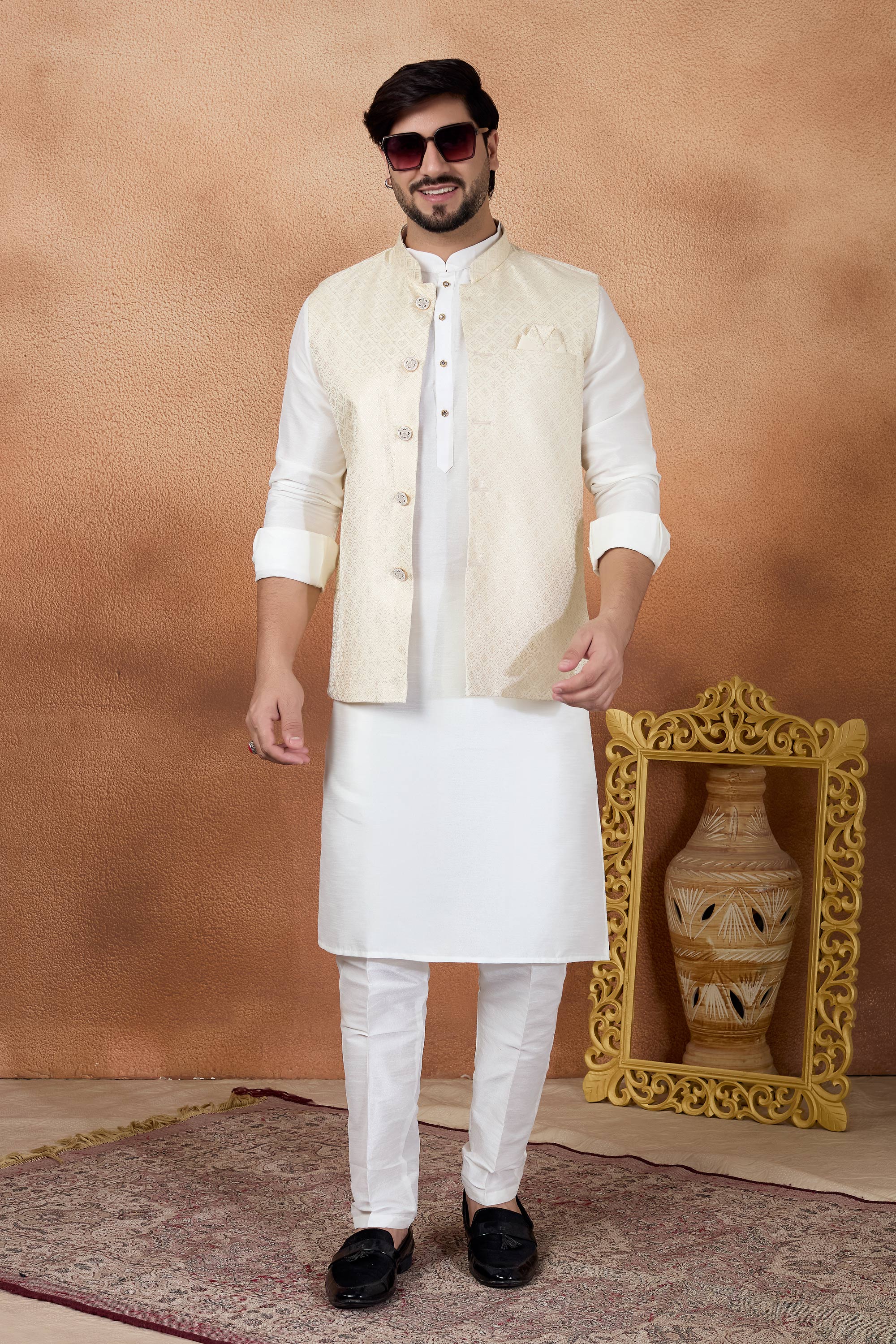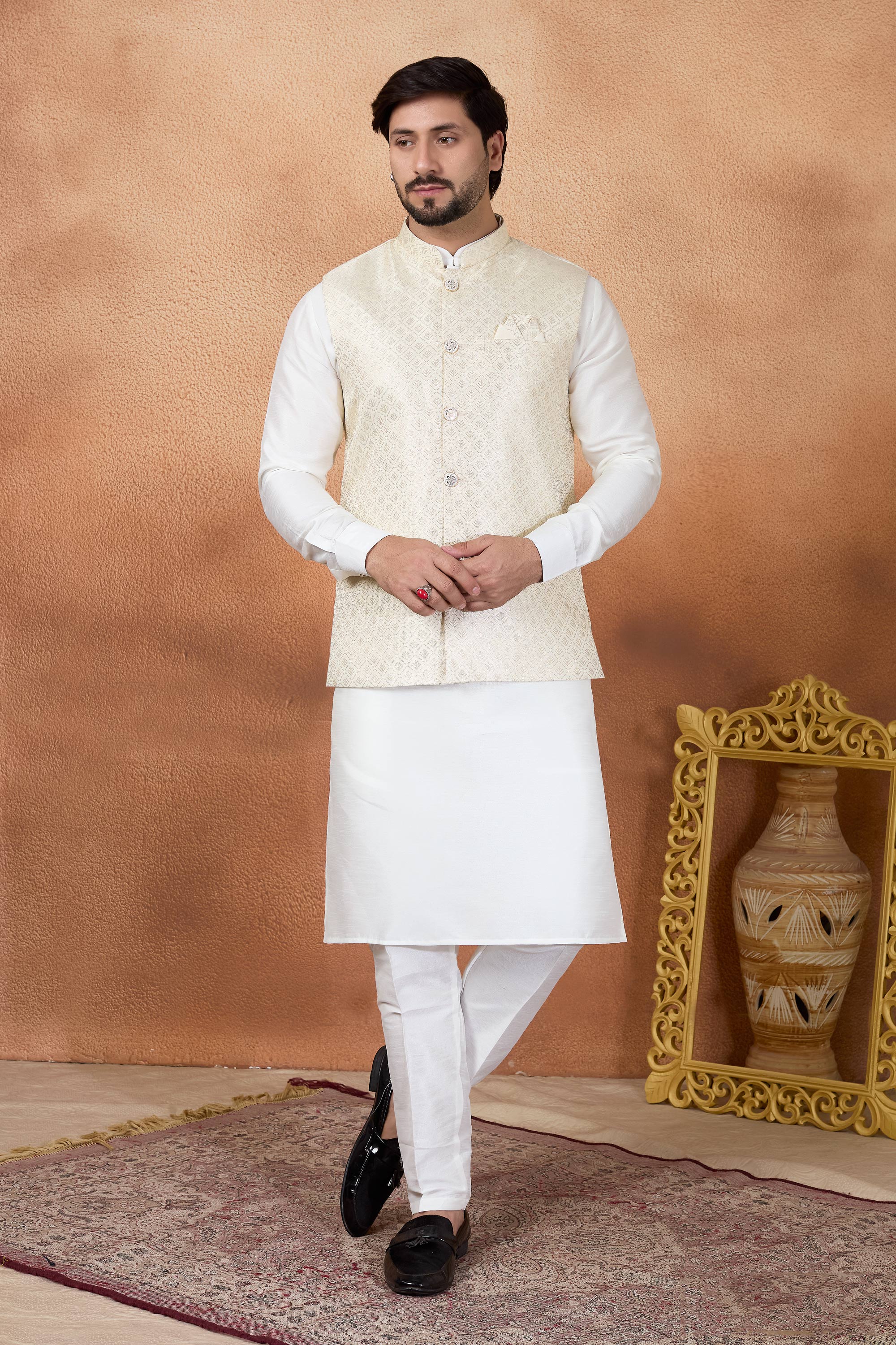 Upgrade your festive wardrobe with this Mens Kurta and Aligadhi Pant with Jacket Set, designed to blend classic tradition with modern elegance. Crafted from jacquard fabric and art Banarasi silk, this ensemble is ideal for weddings and special occasions, with slight color variations possible due to digital photography.