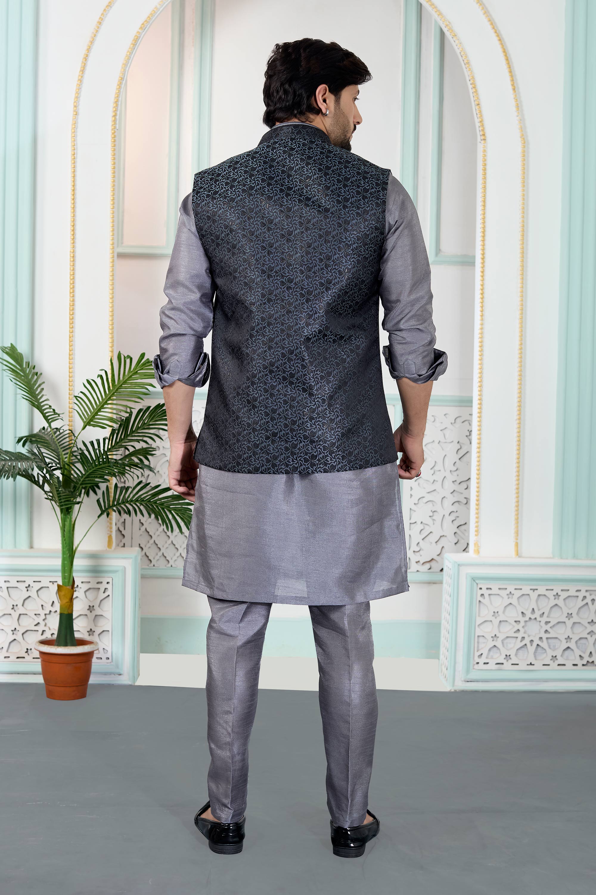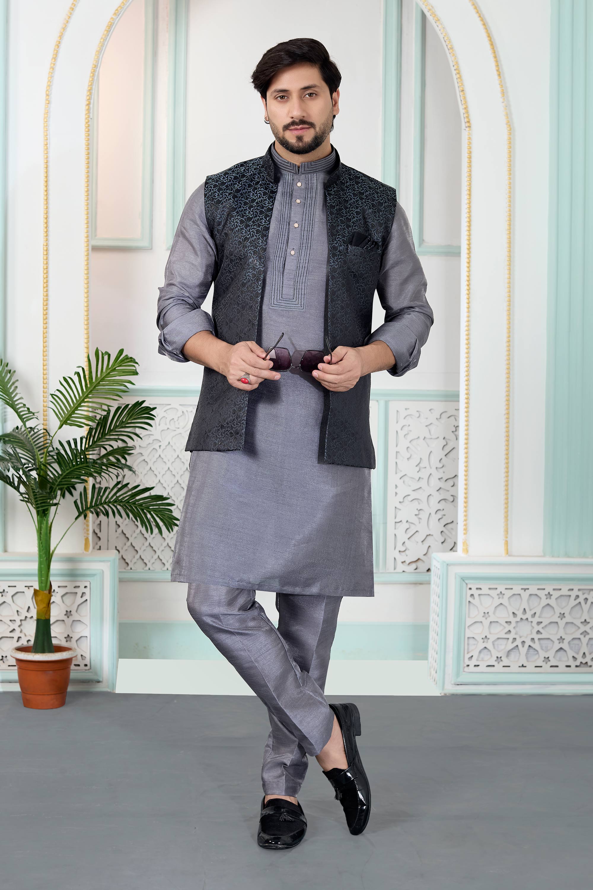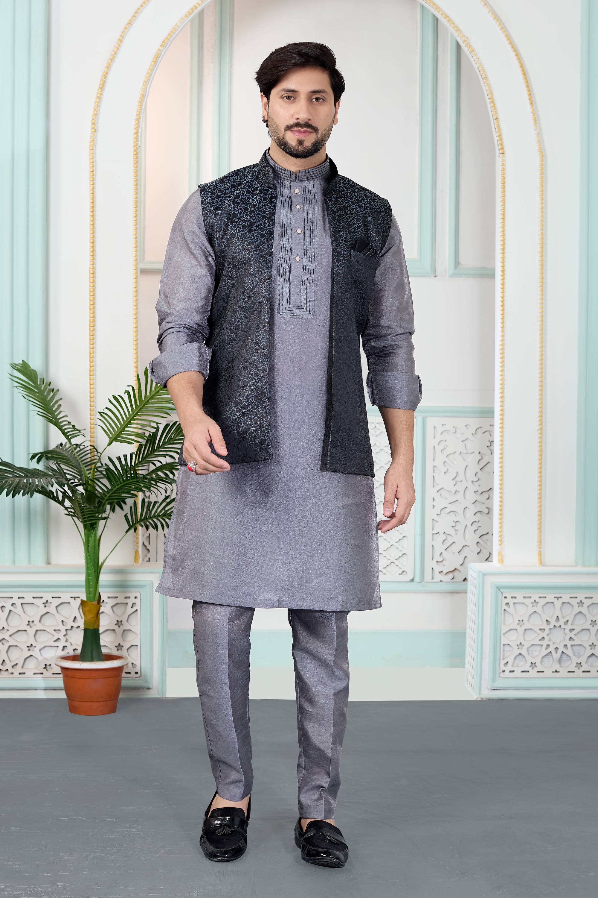 Jacquard Fabric Grey Men Readymade Kurta And Aligadhi Pant With Jacket For Wedding Wear