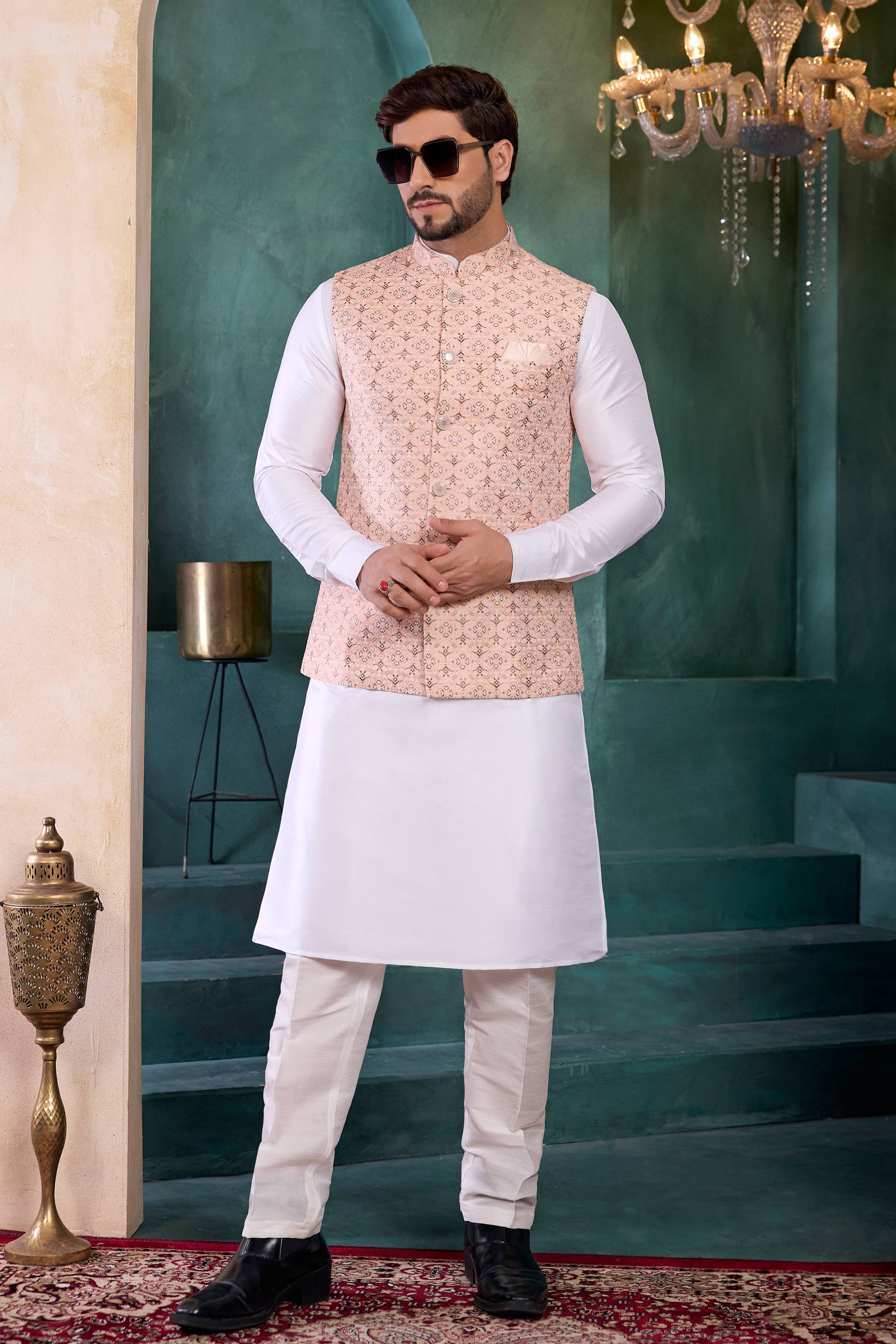 Turn heads at any celebration with this Gorgeous Reach Color Wedding Function Designer Readymade Mens 3-Piece Kurta Set. Perfectly tailored for elegance and comfort, this outfit includes a premium kurta, a chic jacket, and Aligadhi-style pants. Crafted with high-quality fabric, it is breathable, stylish, and designed to make you stand out during festive gatherings or wedding ceremonies. The beautiful color and intricate details on the jacket give it a modern yet traditional charm. Easy to wear and lightweight, this ready-to-wear ensemble is perfect for men seeking sophistication with minimal effort. Elevate your ethnic wardrobe with this classy piece today!